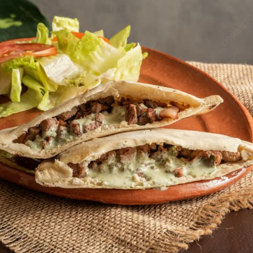 Pan árabe relleno de sirloin con tocino, cebolla y jocoque.