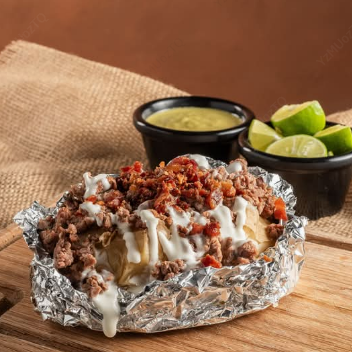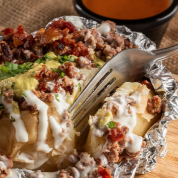 Servidas con crema, mantequilla, tocino y con sirloin.