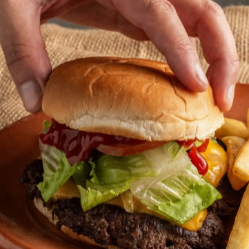 Carne molida de la casa con tocino, queso, lechuga, tomate y cebolla.