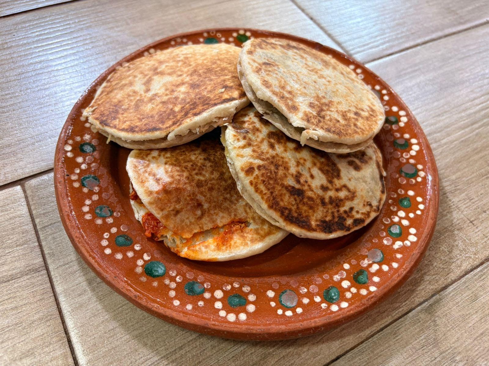 Rellenos disponibles a elegir 1: picadillo, papas verdes, rajas con queso, frijoles, huevo, asado, queso, prensado, discarda, arriero, papas rojas.