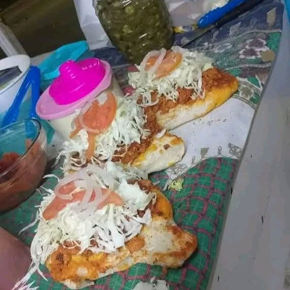 Carne de puerco adobada, chile, cebolla, repollo, tomate, aderesos, salsa