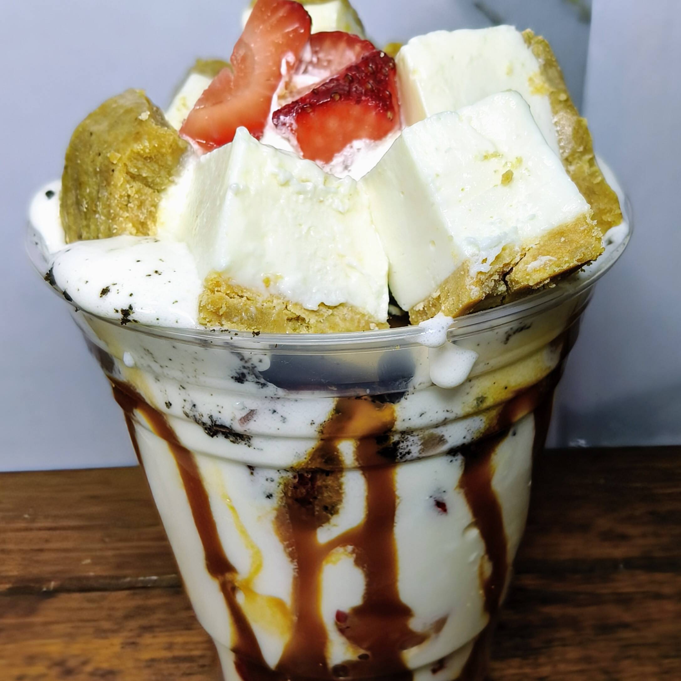 fresas con crema con jarabe y topping a elección 12oz