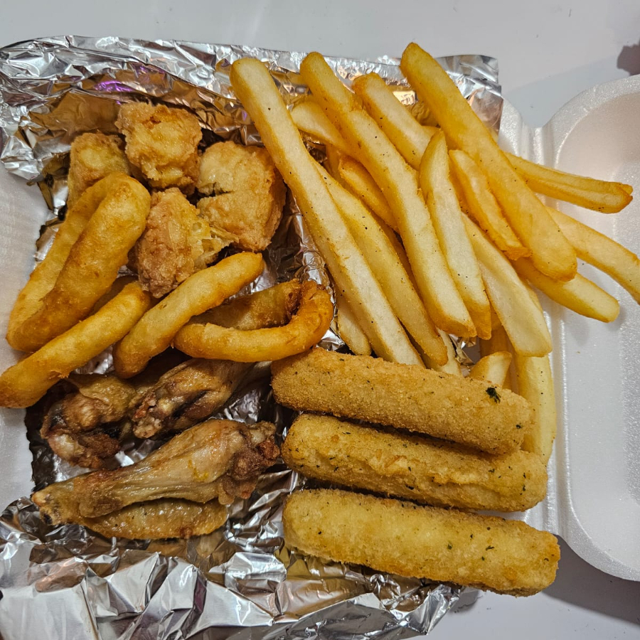 4 BONELESS, 4 ALITAS, 4 AROS DE CEBOLLA, 3 DEDOS DE QUESO Y 150 GR DE PAPAS