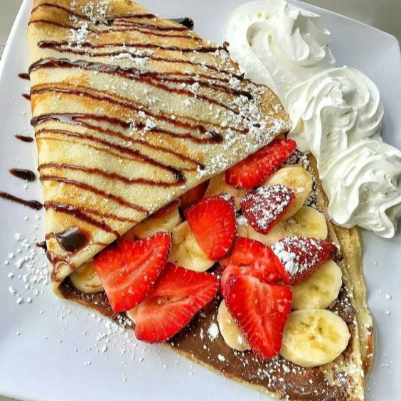 Deliciosa crepa de vainilla con crema de avellana, fresa natural, platano y nuez hawaiana