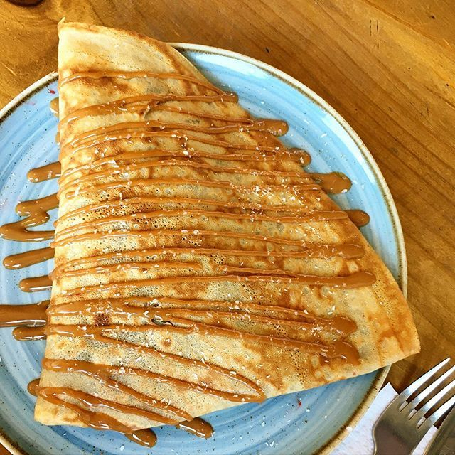 Deliciosa crepa de vainilla con cajeta, platano rebanado. frosting de queso crema, nuez hawaiana
