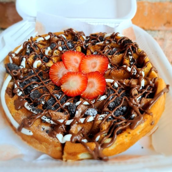 Deliciosos y esponjoso waffle de vainilla con cajeta, galleta oreo, fresa natural y lechera