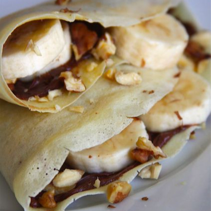 Deliciosa crepa de vainilla con crepa de avellana, platano rebanado, nuez hawaiana y chocolate kinder