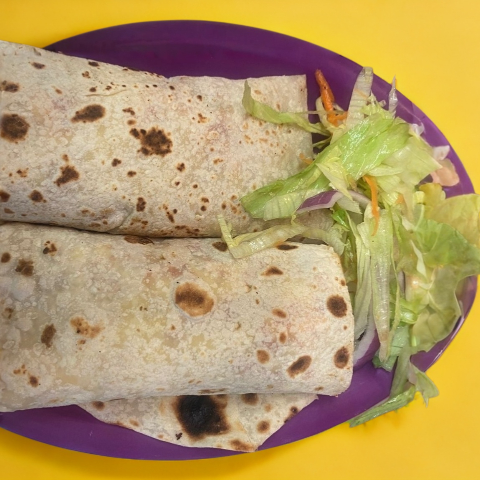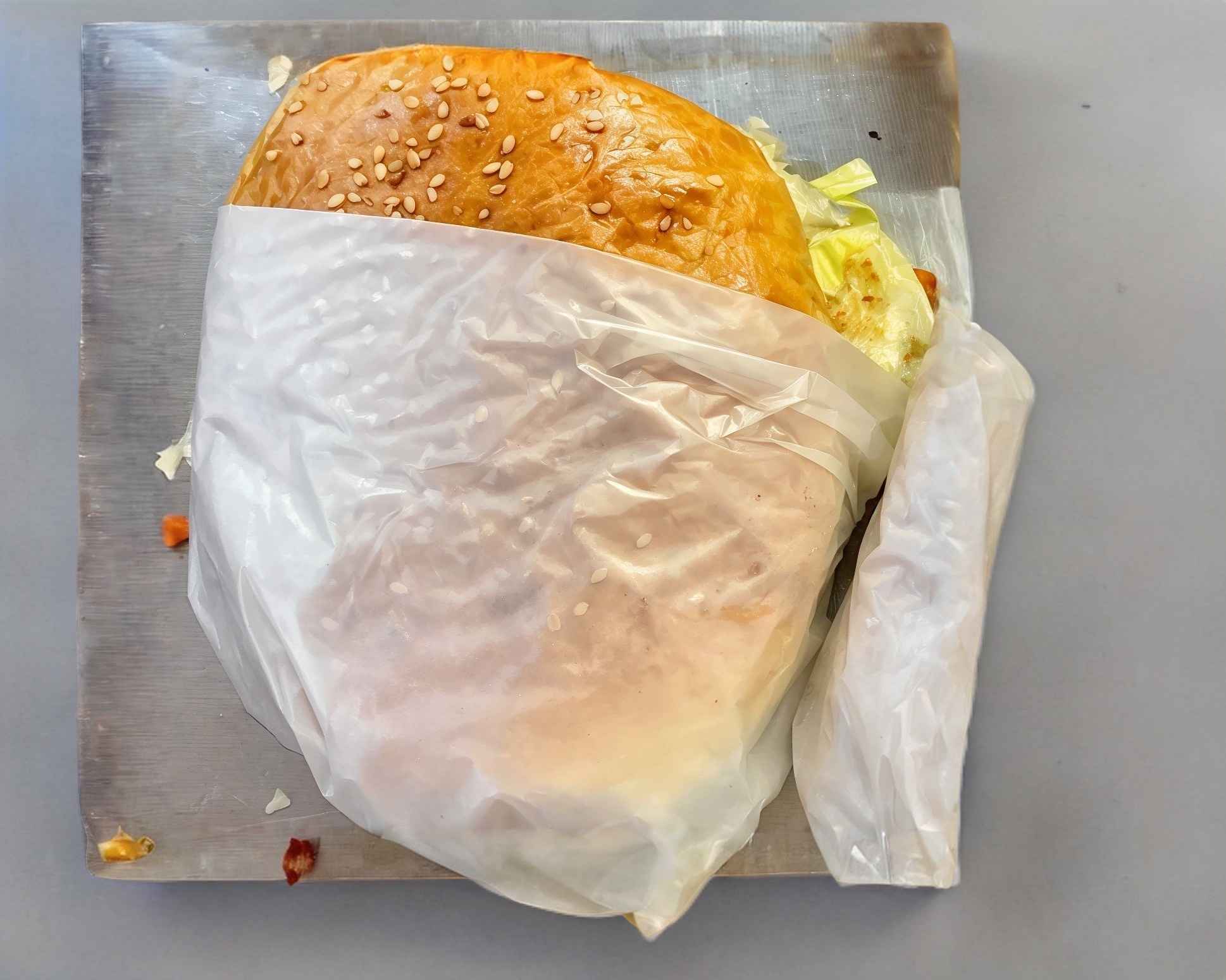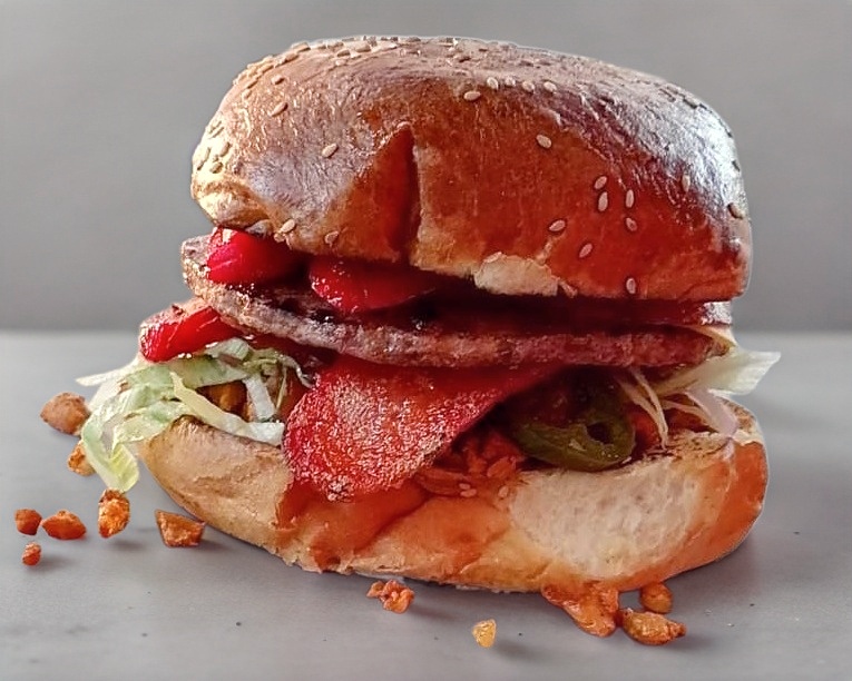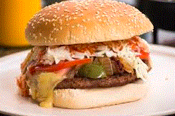 Pan de hamburguesa con carne de trompo, jamón, queso blanco y verdura.