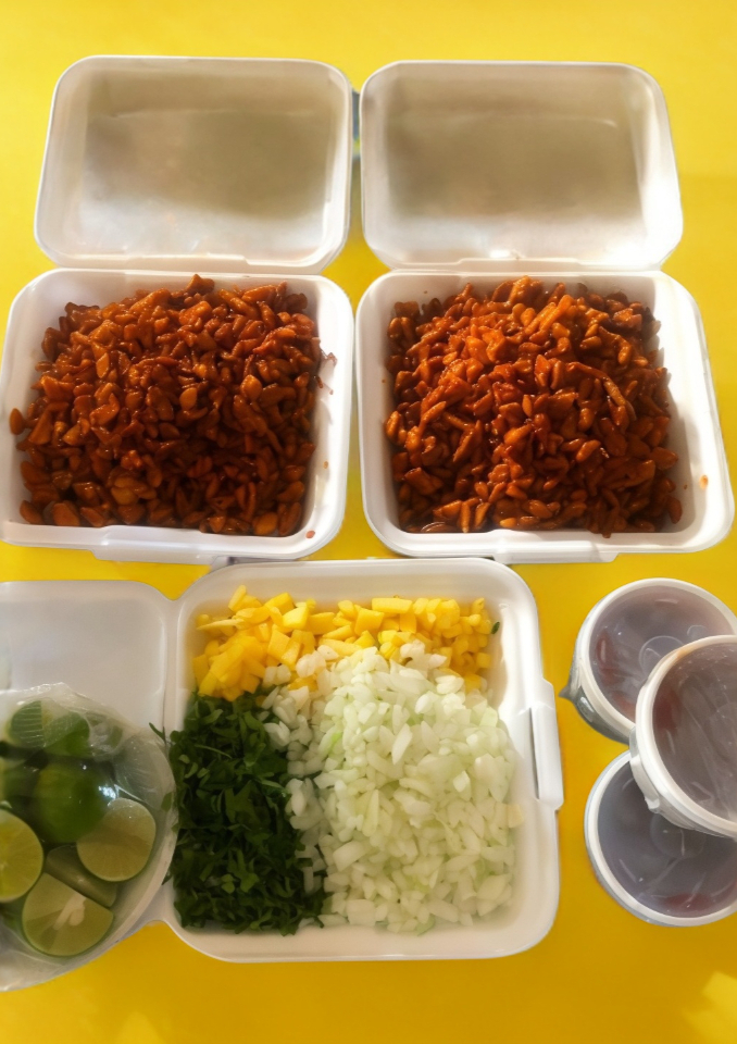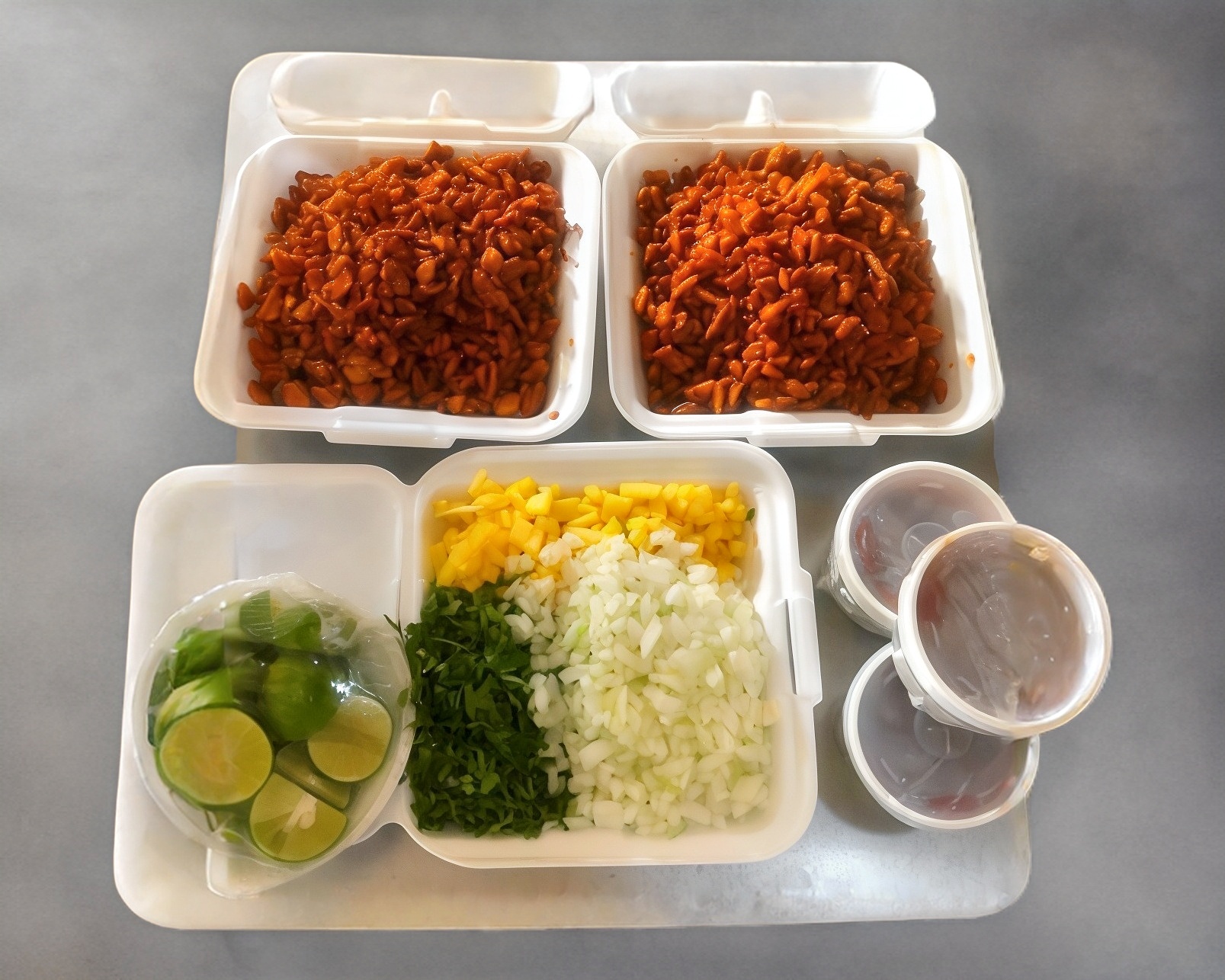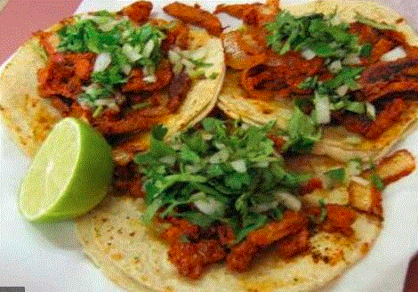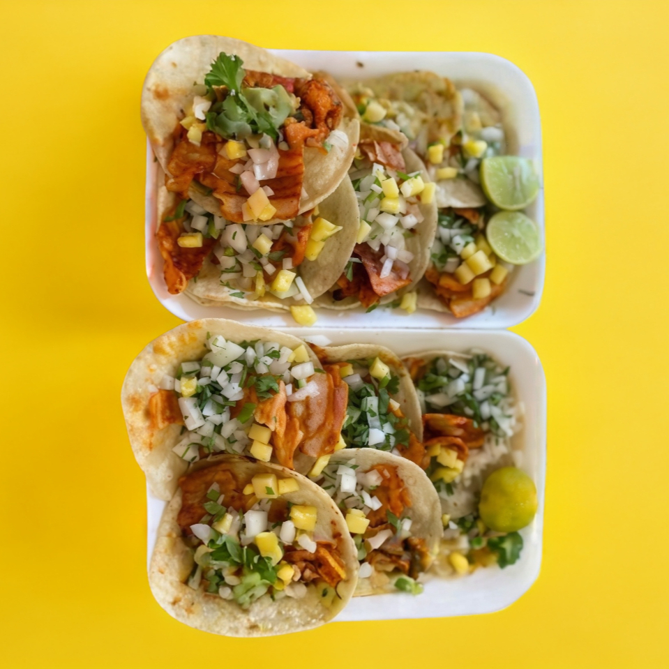 Carne de trompo, bistec, tocino, jamón, cebolla y queso, con 20 tortillas de maíz.
