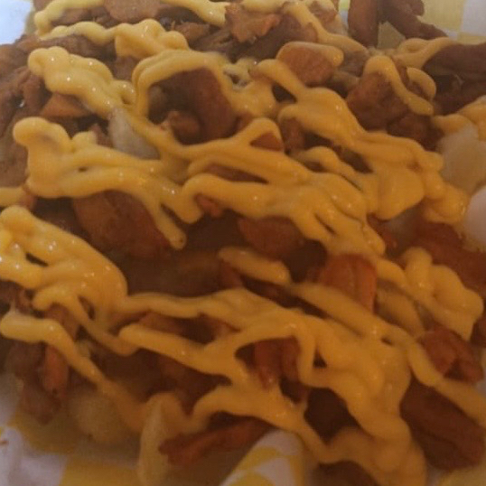 Papas queso amarillo mayonesa catsup y mostaza acompañada de carne de (pastor o trompo