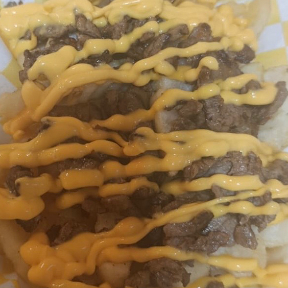 Papas frita con bistek de res acompañada de queso amarillo mayonesa mostaza y chiles