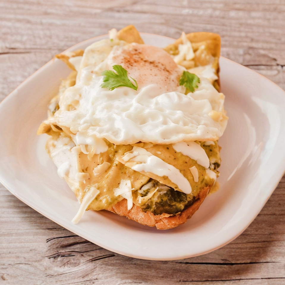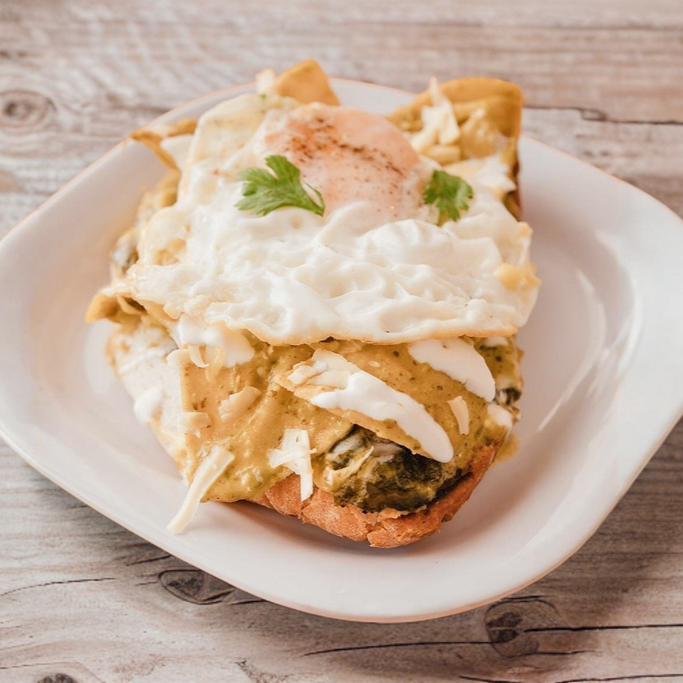 Media pieza de pan francés con una capa de frijoles, acompañada de un guiso a tu elección, chilaquiles con la salsa de tu preferencia, incluyen queso y crema y un huevo estrellado