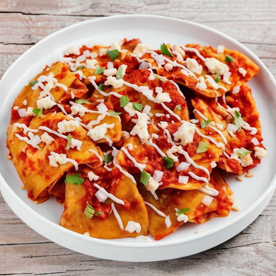 Porción personal de totopos bañados en salsa a elegir, con queso y crema, acompañados de frijoles refritos.