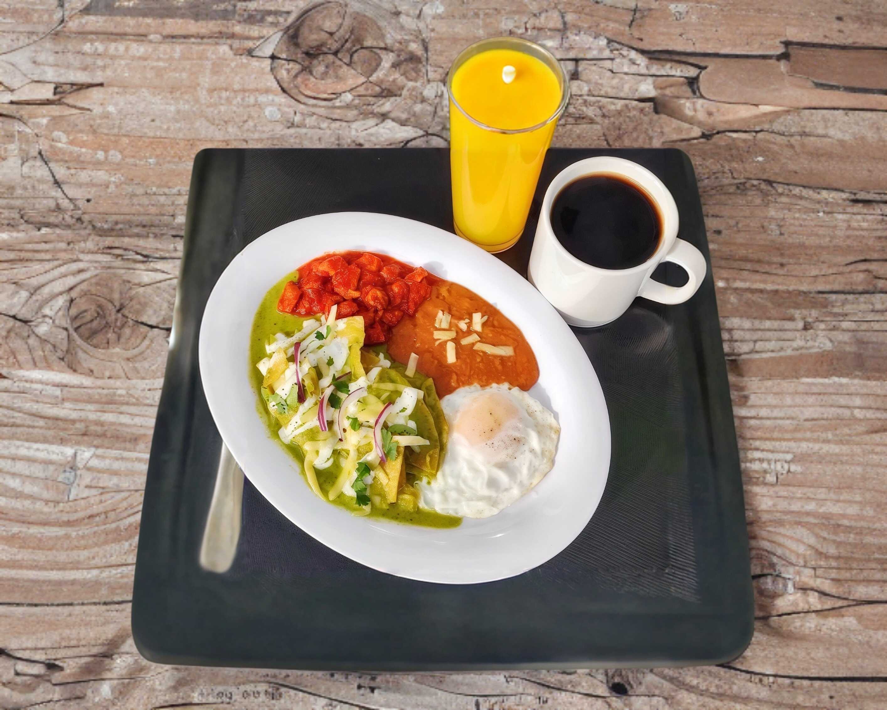 Chilaquiles acompañados de un huevo estrellado, un guiso de tu elección y frijoles refritos caseros