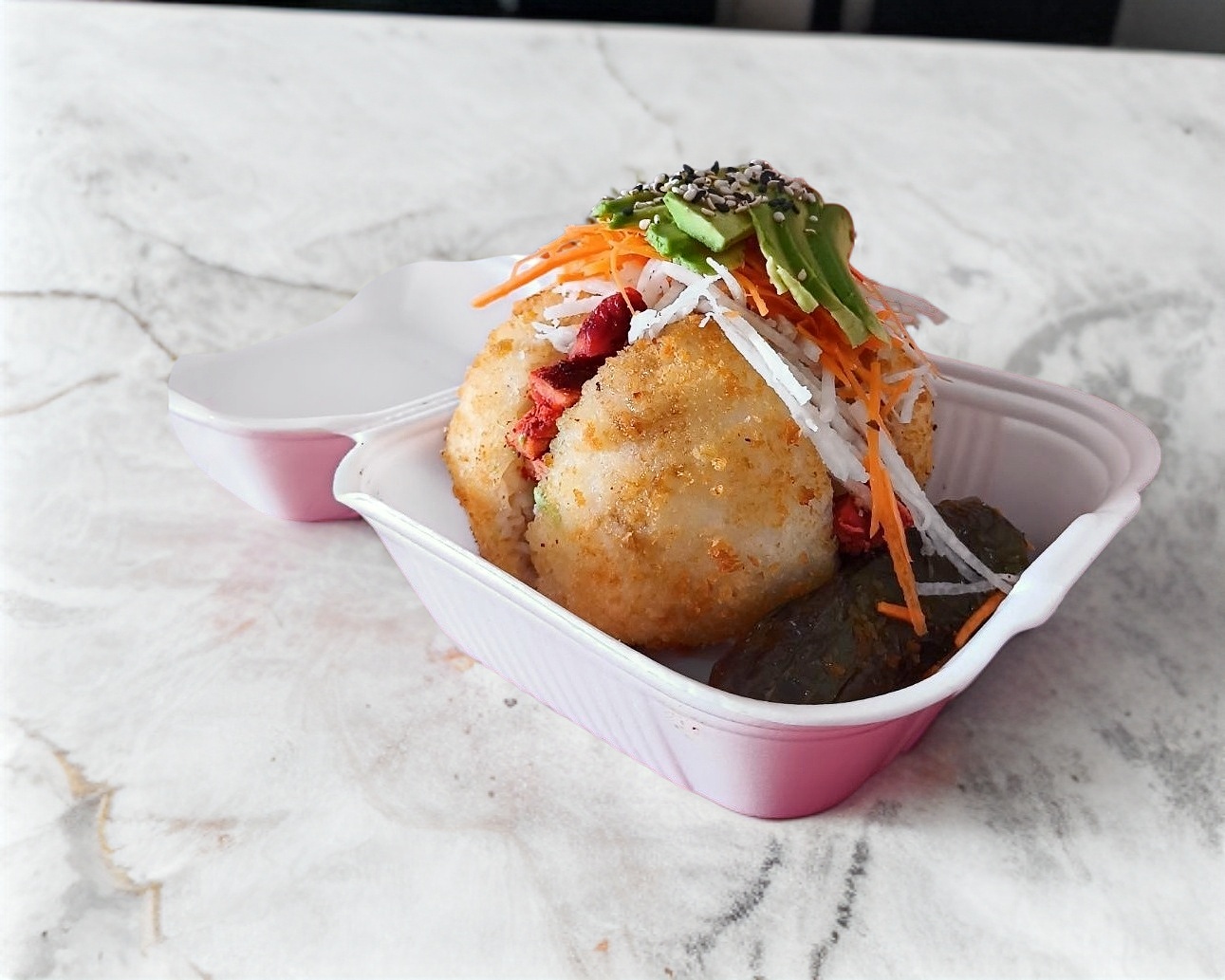 Bola de arroz con base de queso crema y aguacate rellena de carne adobada cubierta con salsa de anguila y aderezo chipotle. Todas las bolas incluyen zanahoria, jícama, pepino y chile toreado