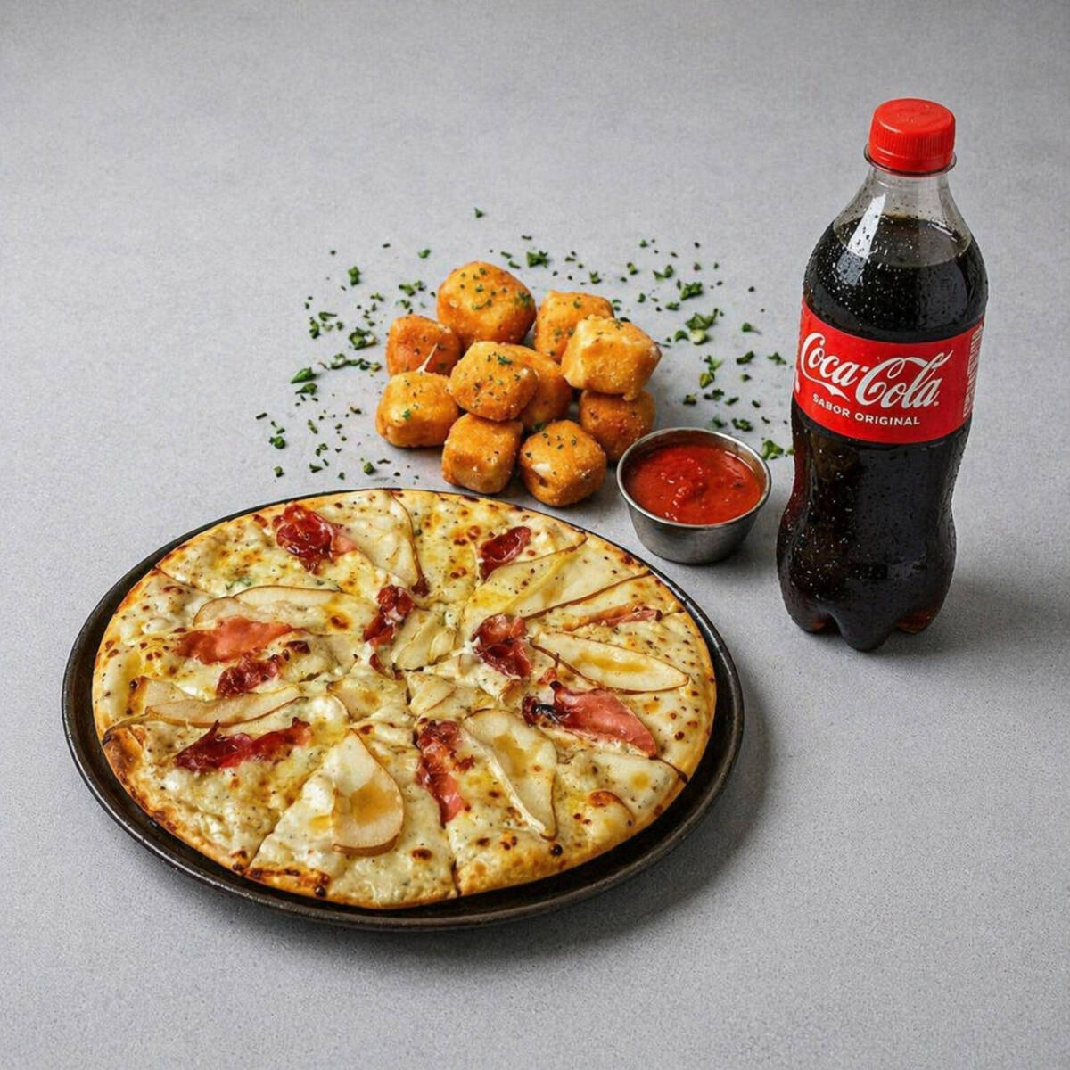 Pizza con prosciutto y pera, acompañada de palline di formaggio y 1 refresco.