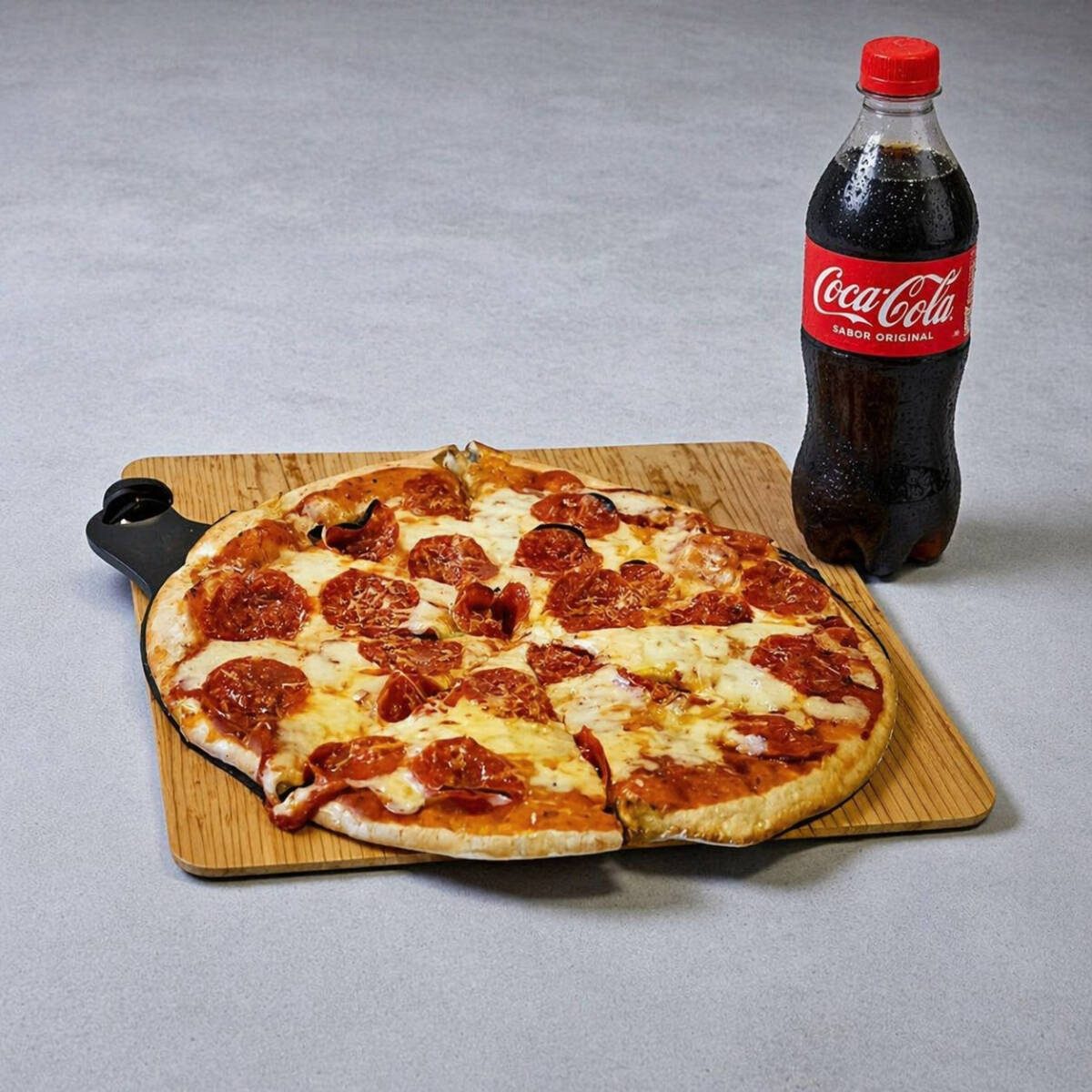 Combo de pizza peperoni individual acompañada de una bebida gaseosa personal.