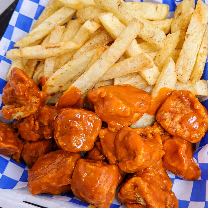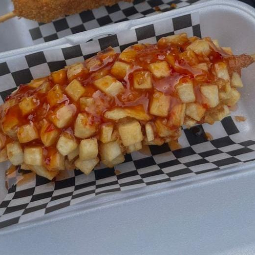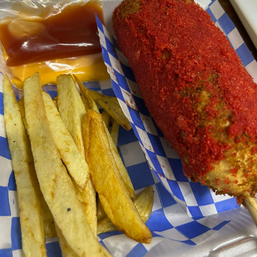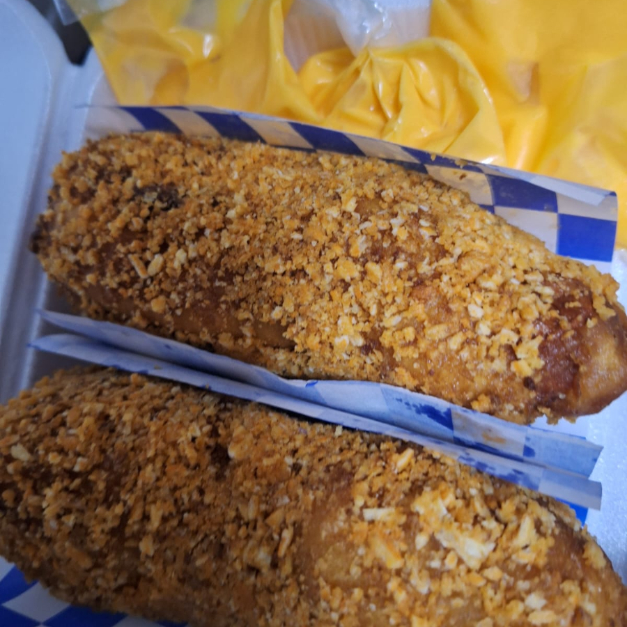 una deliciosa combinación de salchicha y queso en palito, cubiertas con una suave masa doradita y crujiente. Puedes elegitu cobertura favorita, en este caso cuadritos de papas fritas(no se puede el relleno de puro queso a menos de que lo ordenes)