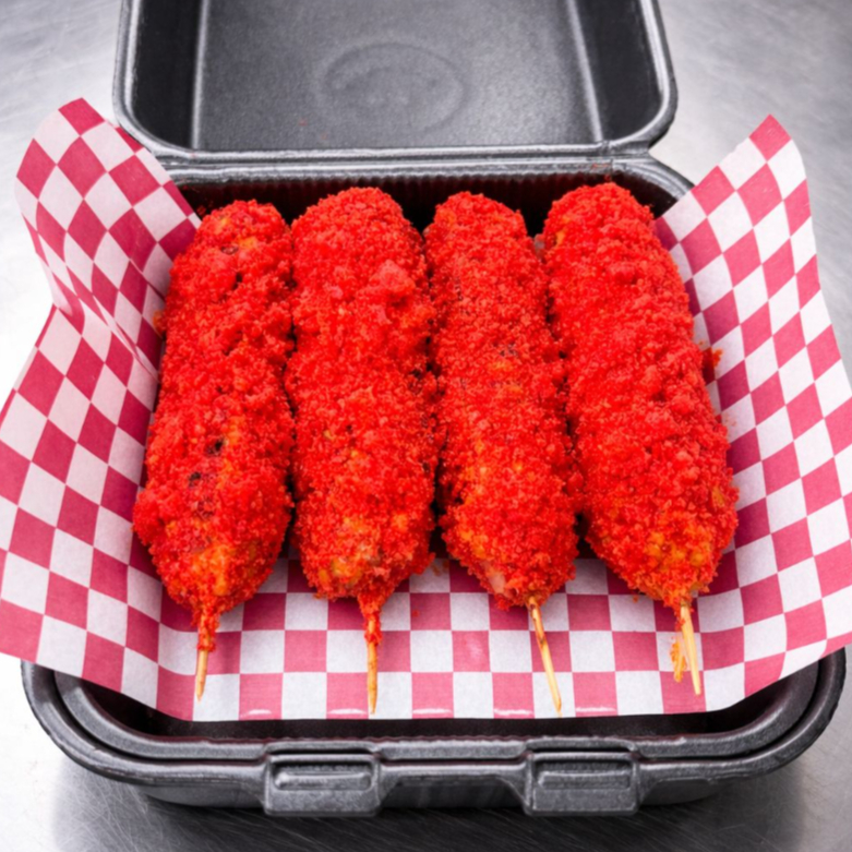 ORDEN INDIVIDUAL BANDERILLA COREANA ENCHILADA CON POLVO ESTILO TAKIS FUEGO. CRUJIENTE POR FUERA SUAVE POR DENTRO. NO INCLUYE ADEREZOS, FAVOR DE ESCOGERLOS A PARTE.