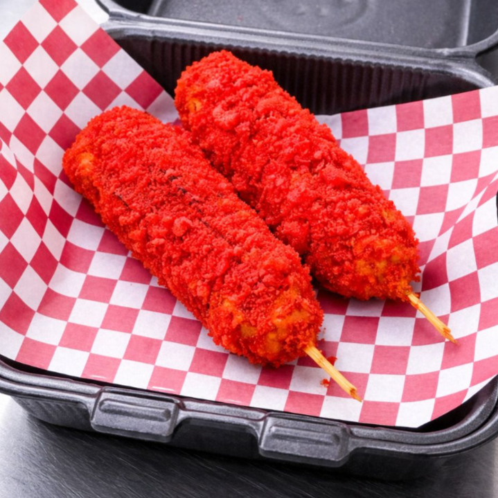 ORDEN DE 3 BANDERILLAS COREANA ENCHILADA CON POLVO ESTILO TAKIS FUEGO. CRUJIENTE POR FUERA SUAVE POR DENTRO. NO INCLUYE ADEREZOS, FAVOR DE ESCOGERLOS A PARTE.