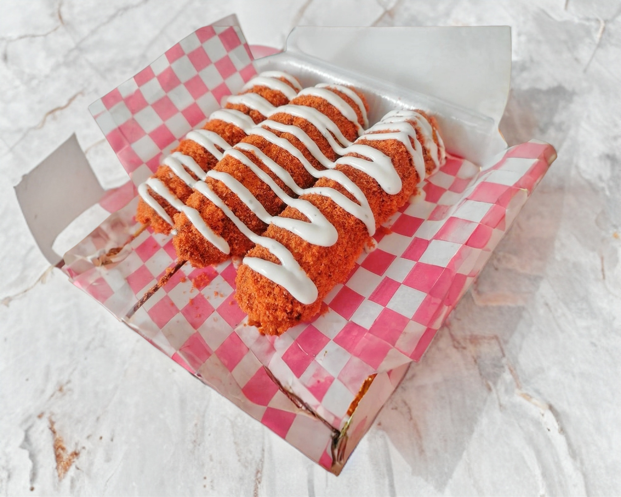 ORDEN DE 3 BANDERILLAS COREANAS CRUJIENTES, SABOR NATURAL. ACOMPAÑALAS DE TUS ADEREZOS FAVORITO POR UN COSTO ADICIONAL. (PORCIÓN PERSONAL)