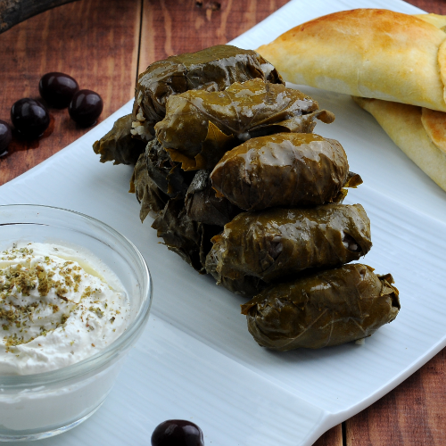 3 hojas de parra + 2 hojas de repollo + 1 fatayer + 1/4 arroz con fideo + 1/4 de jocoque + 1 pan + 1/4 ensalada turca