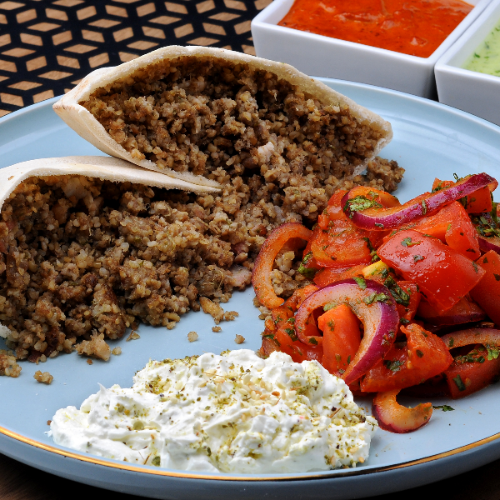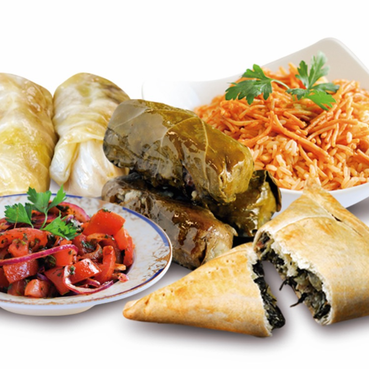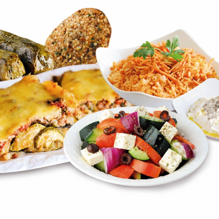 300g de Moussaka, 2 hojas de parra, 2 kippe bola, 250g de ensalada turca, 250g de jocoque, 500g de arroz con pistache, nuez y almendra.