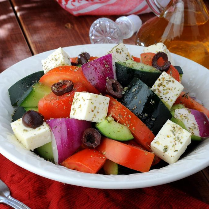 Ensalada griega pepino, jitomate, cebolla morada, aceitunas negras, limón,queso panela y oregano, 1/4.