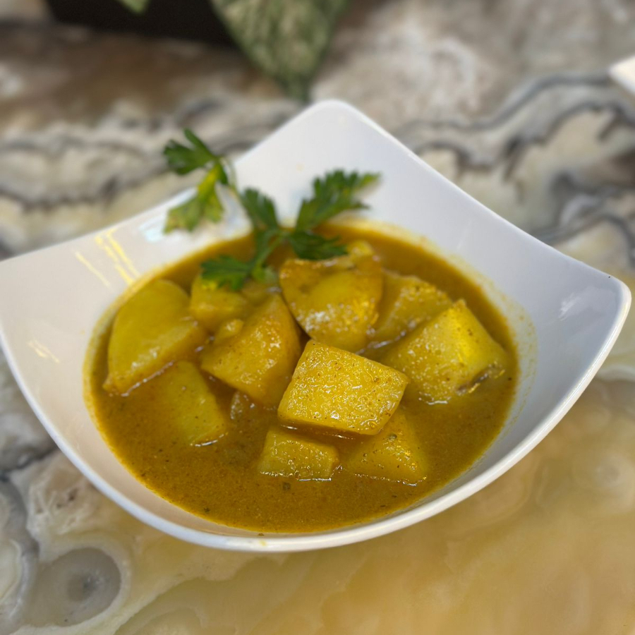 Papas al curry : Papas cortadas en cuartos cocidas y bañadas en salsa de curry