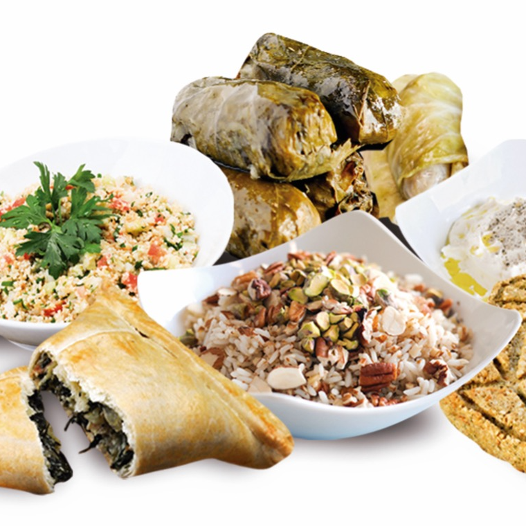 Tapule, jocoque, arroz con pistache, nuez y almendras, 1 fatayer, 1 kippe charola, 4 hojas de parra, 1 repollo.