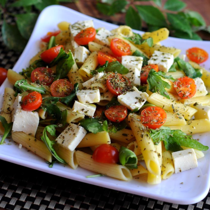 pasta con tomate Cherry , queso panela y aderezado con aceite de oliva , sal pimienta y albahaca