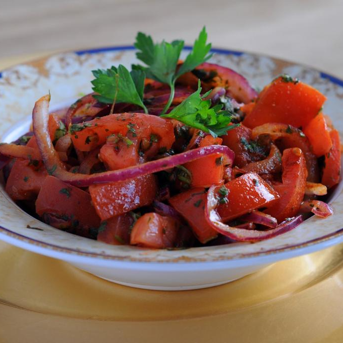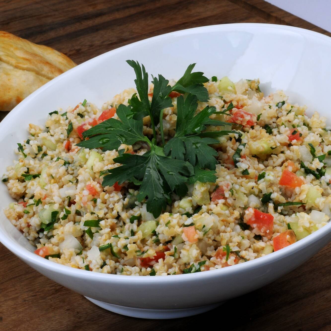 Ensalada árabe vegetariana, compuesta de trigo, cebollita, perejil, hierbabuena, pepino, jitomate y zumo de limón 1/2 litro.