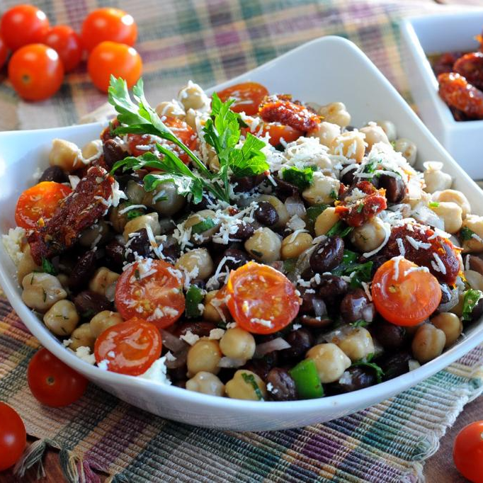Africana, garbanzo, frijol negro, cebolla, perejil, tomillo, limón, queso panela, aceite de oliva, jitomate deshidratado y tomate cherry. 1/4