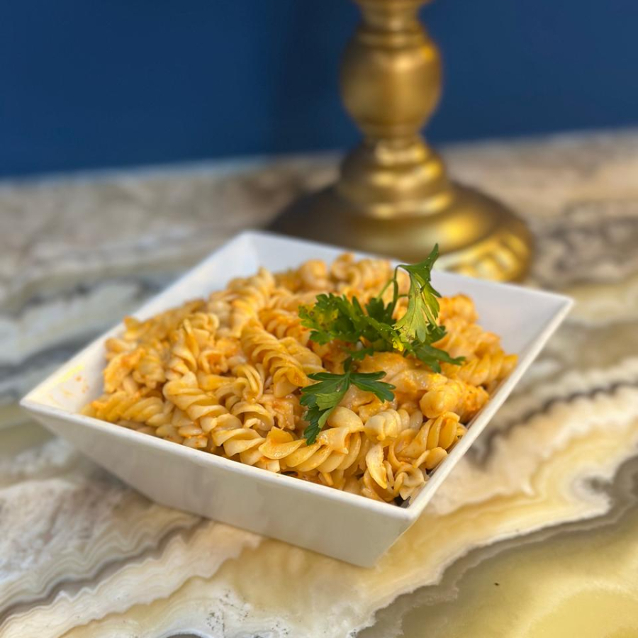 Pasta turca: Pasta fusil bañada en una salsa cremosa de pimientos rojos