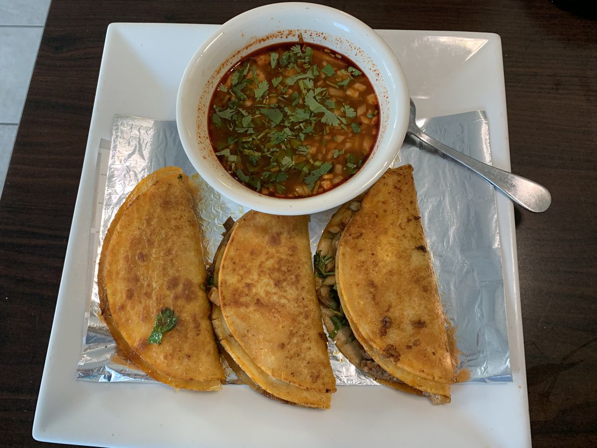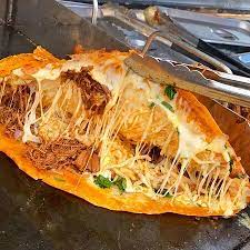 Tortilla de harina del tamaño de un plato, se parte en dos y lleva queso, carne y tortilla de harina y lleva un consomé de cortesía. Incluye verdura y salsas.