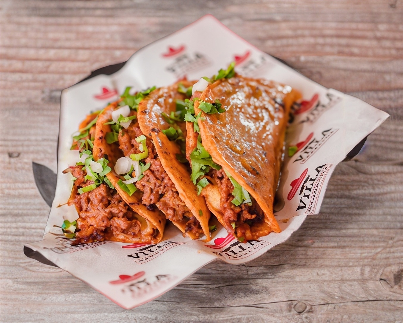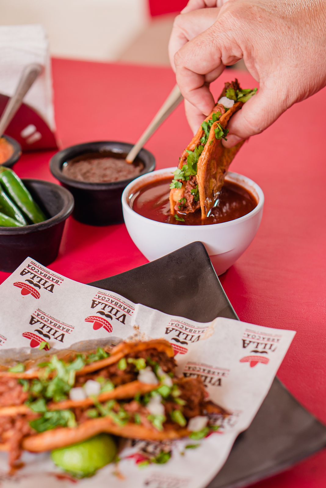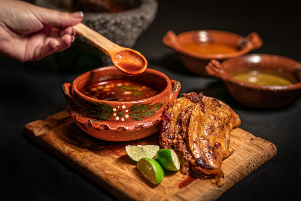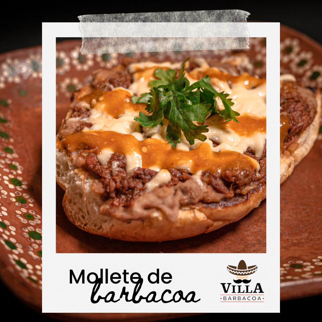 Burro de barbacoa, bañado en salsa verde y crema, gratinado con queso, acompañado de ensalada.