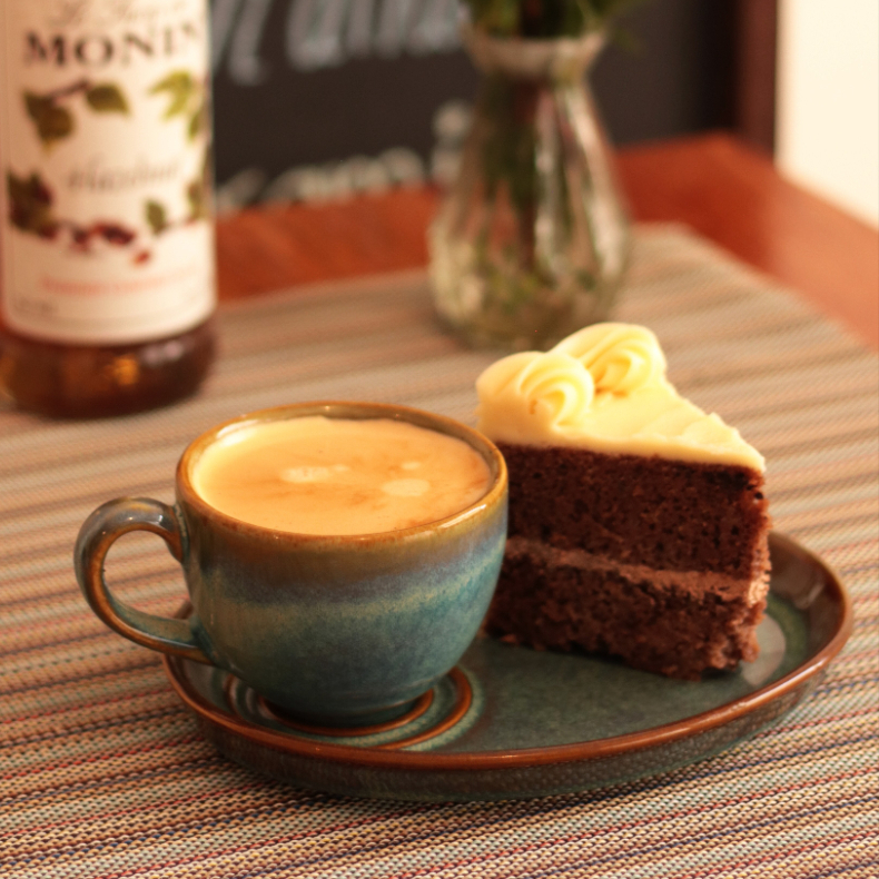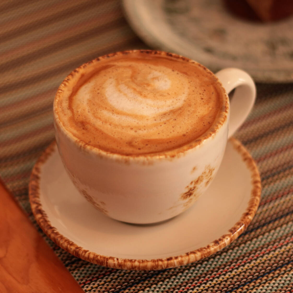 350 ml Café extraído en máquina de espresso, leche vaporizada y espuma de leche, ligeramente endulzado y decorado con canela