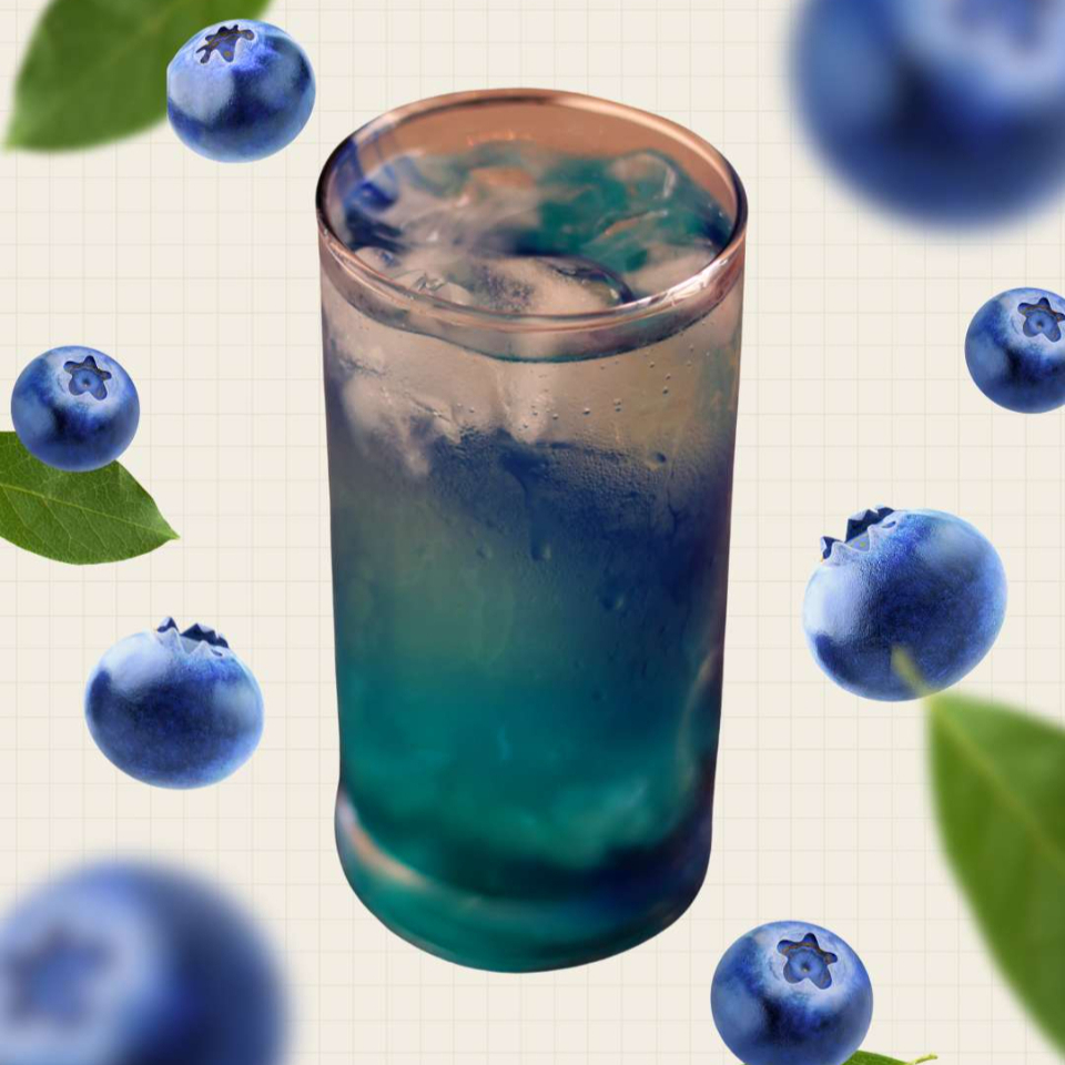 Soda italiana sabor mora azul, acompañada de perlas explosivas, en las rocas.