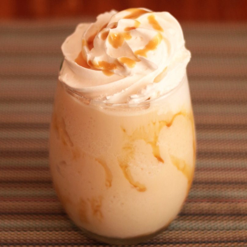 Frappé de hielo y leche, coronado con crema batida y caramelo dorado. Un antojo helado de toque celestial