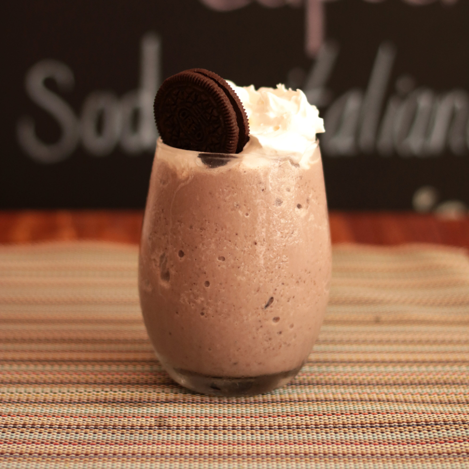 Frappé a base de hielo, leche y galleta oreo, servido con crema batida y una galleta.