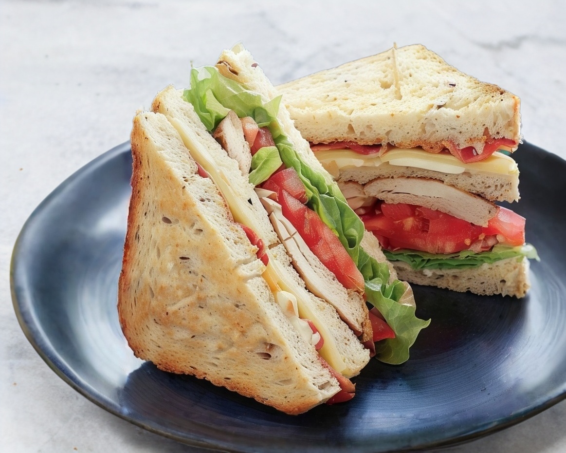 Tocino, jamón, lechuga, tomate, costra de queso o queso amarillo, aderezo de la casa y aguacate.