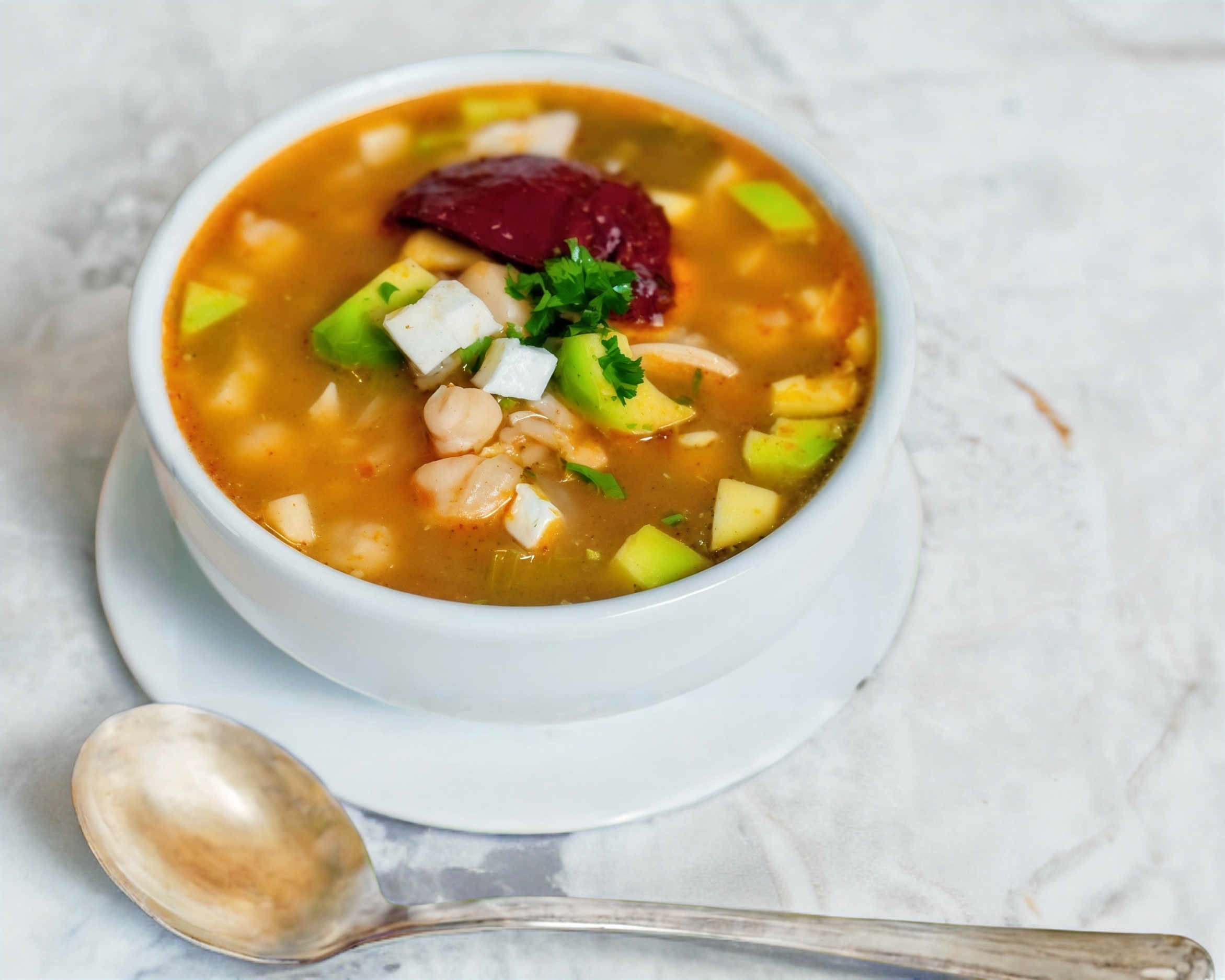 Rico menudo con sus complementos (chile de ábol, orégano, limón, cebolla y pan francés).