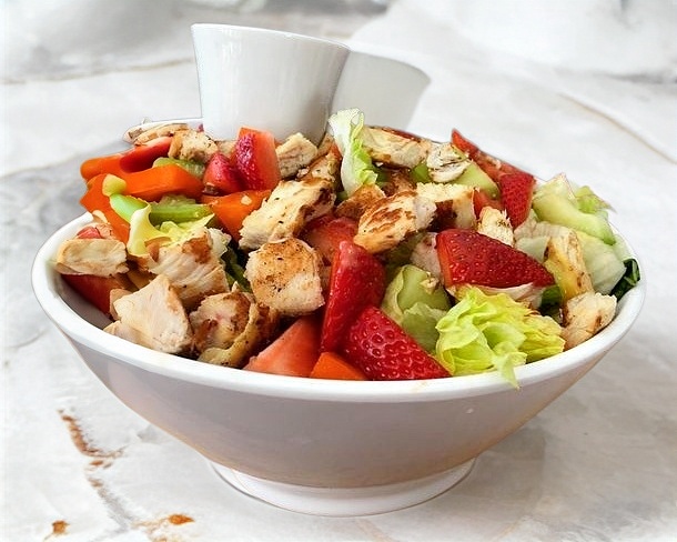 Mix de lechugas, tomate, pimiento, pechuga de pollo, alemendra, crotones y aderezo de la casa