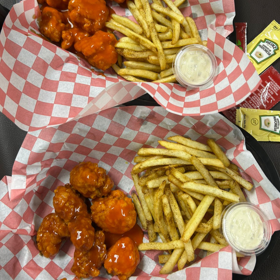 6 pzs de boneless con una o dos salsas acompañado de apio y zanahoria