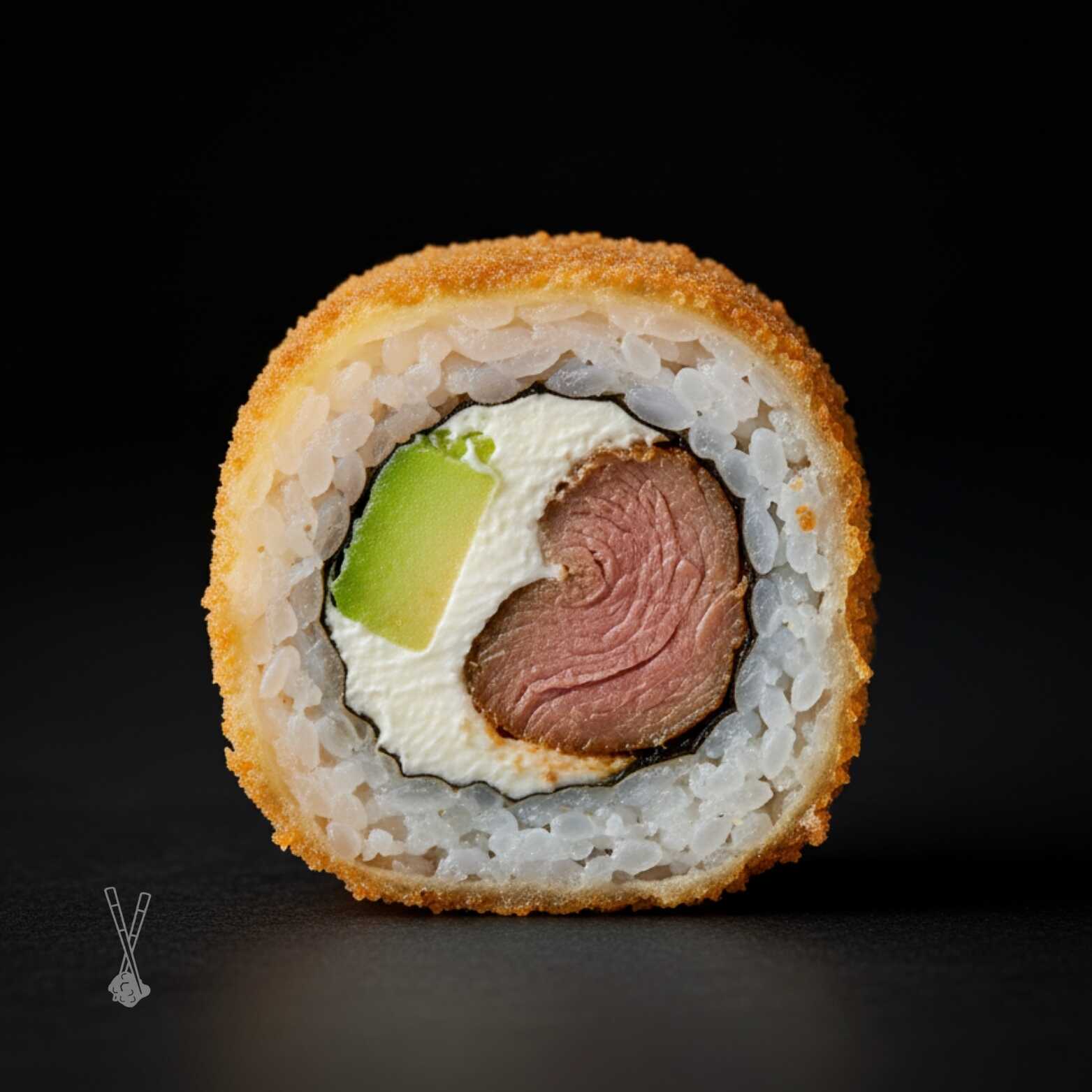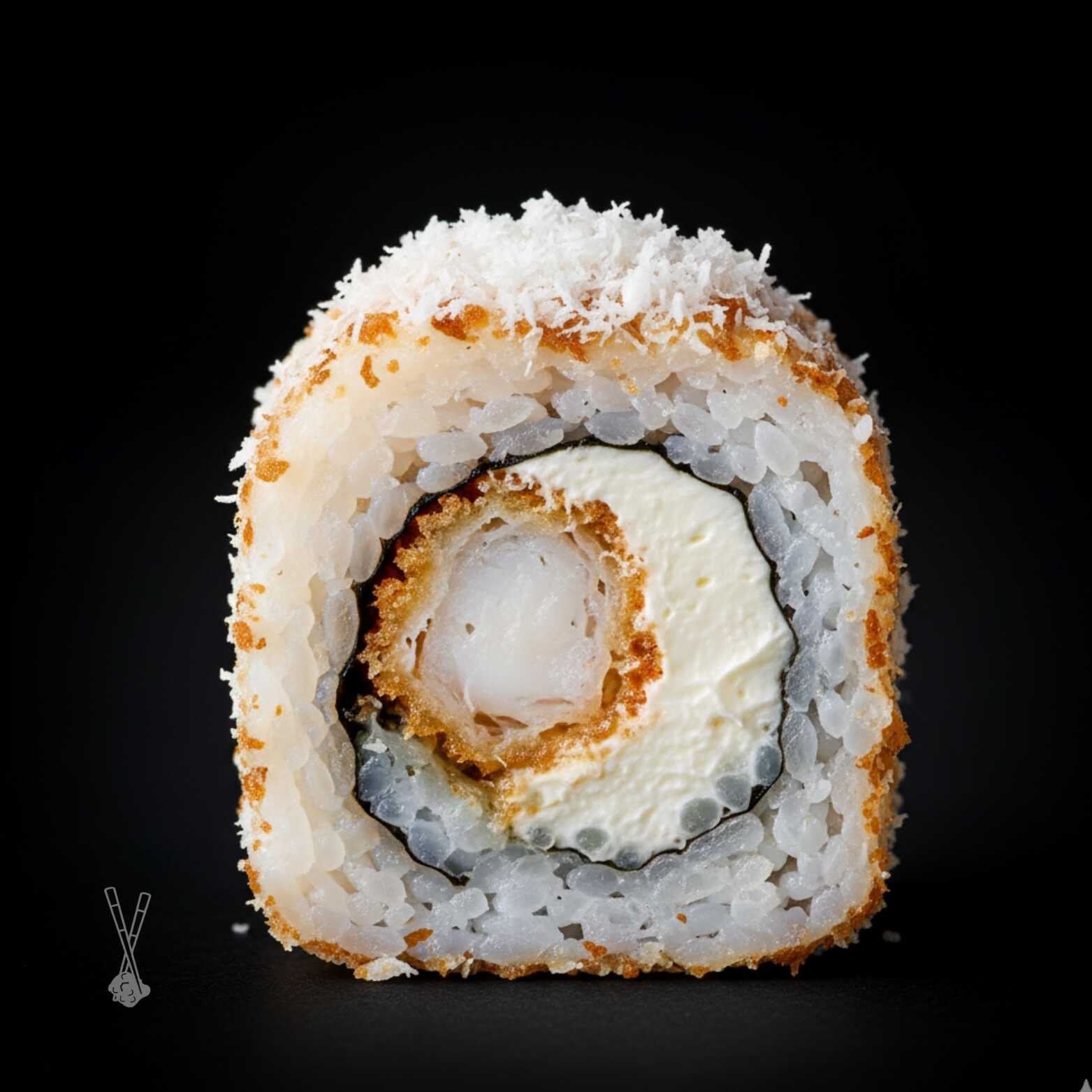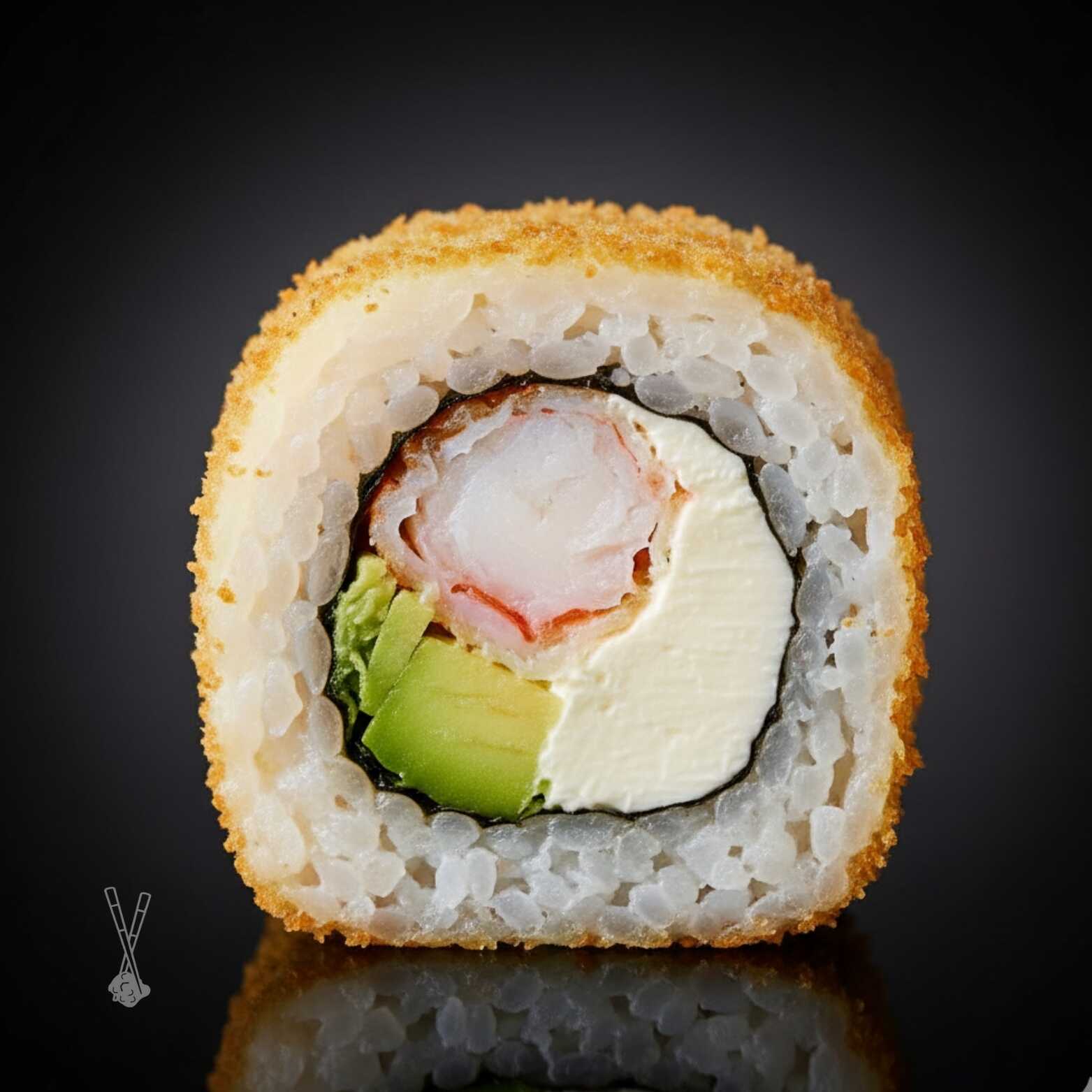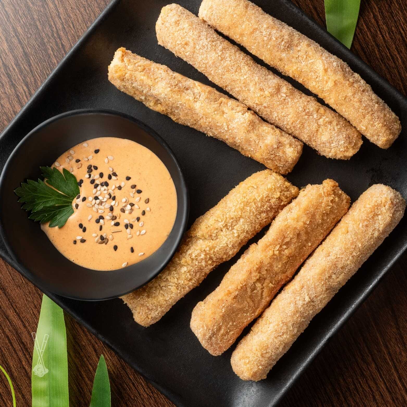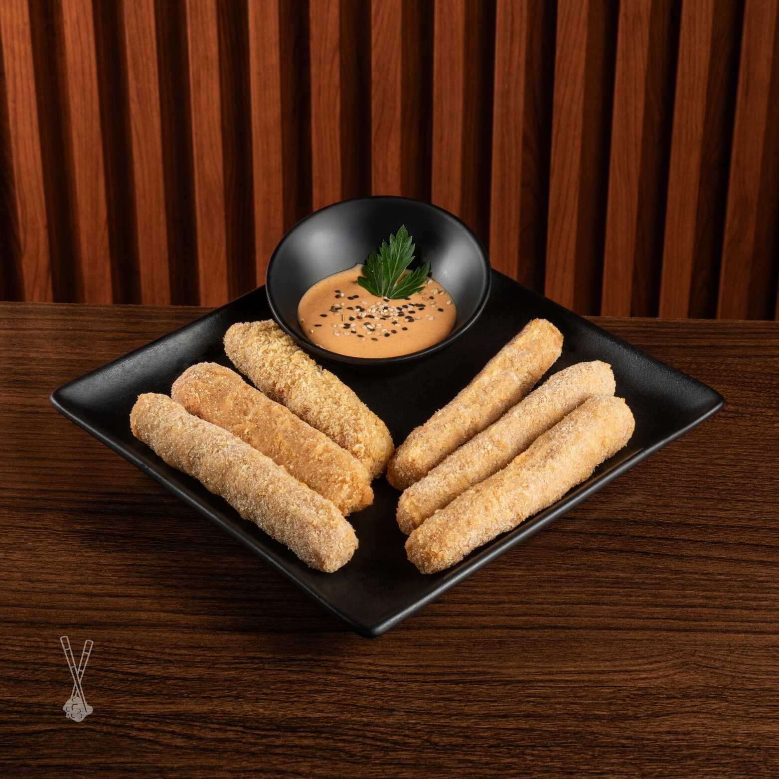 4 camas de surimi enrolladas rellenas de queso crema cubiertos con panko