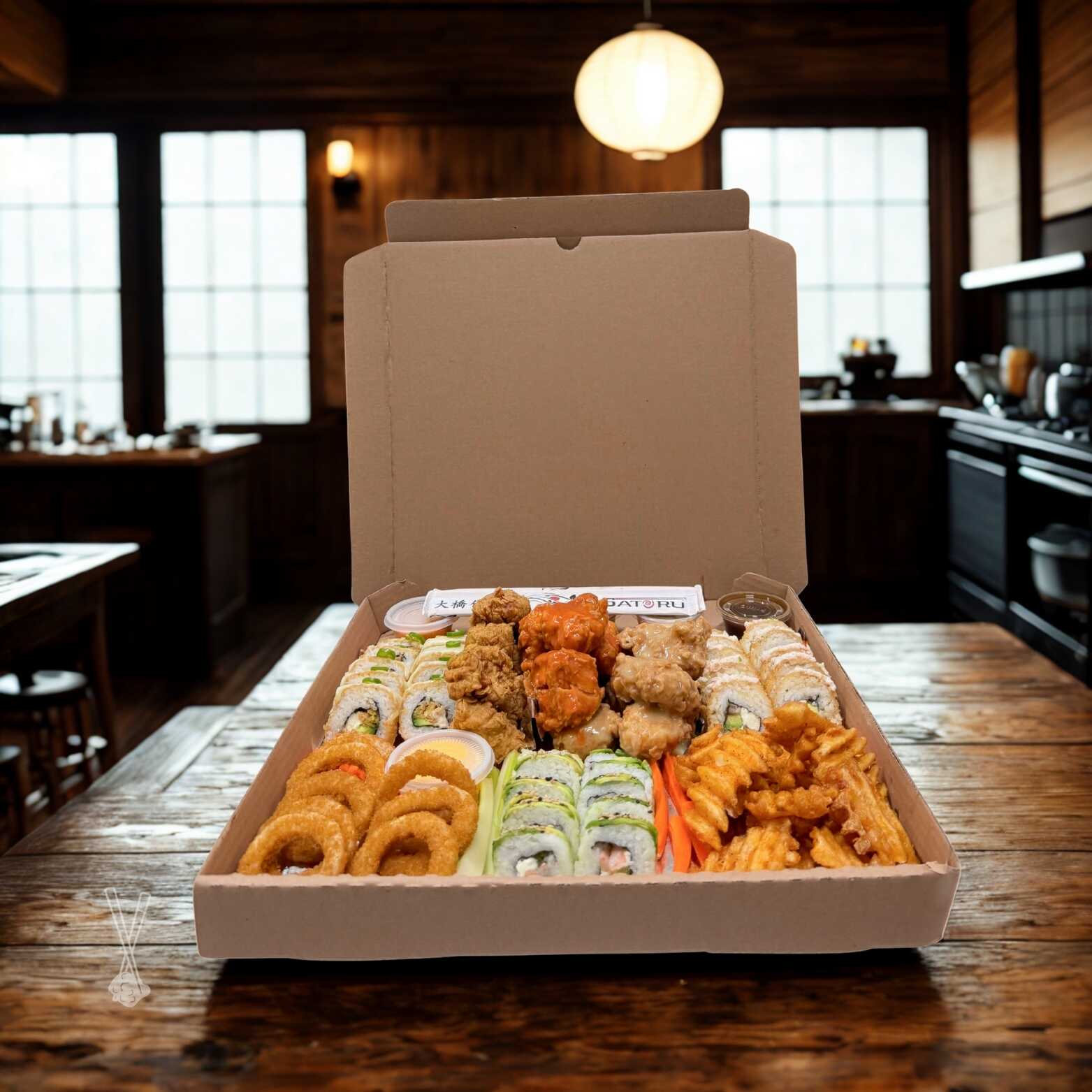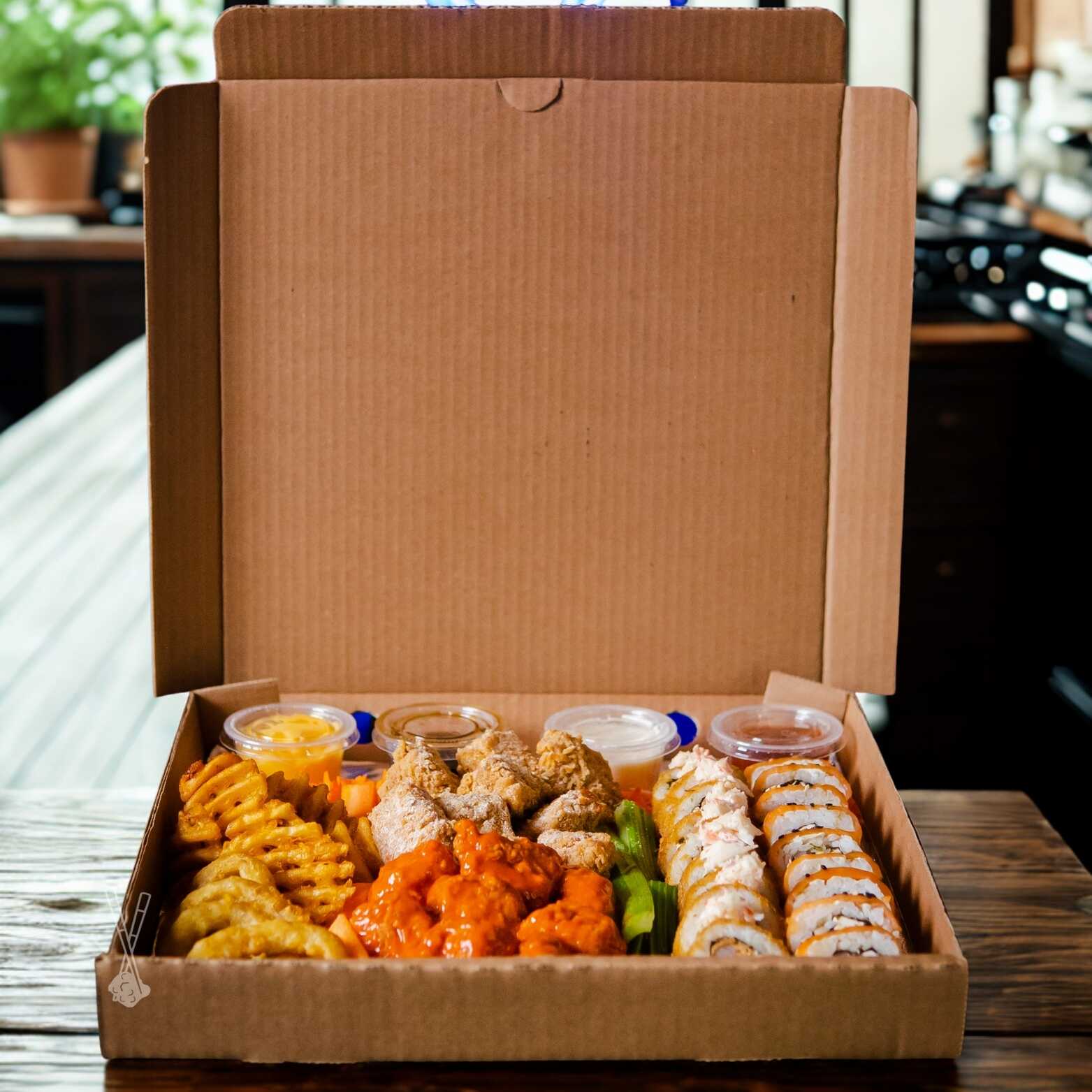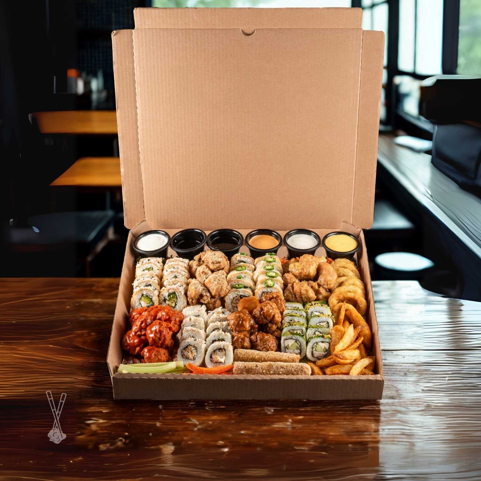 2 Rollos tradicionales. 2 Ordenes de boneless o alitas. 1/2 Orden de papas. 1/2 Orden de aros de cebolla. 4 aderezos.
