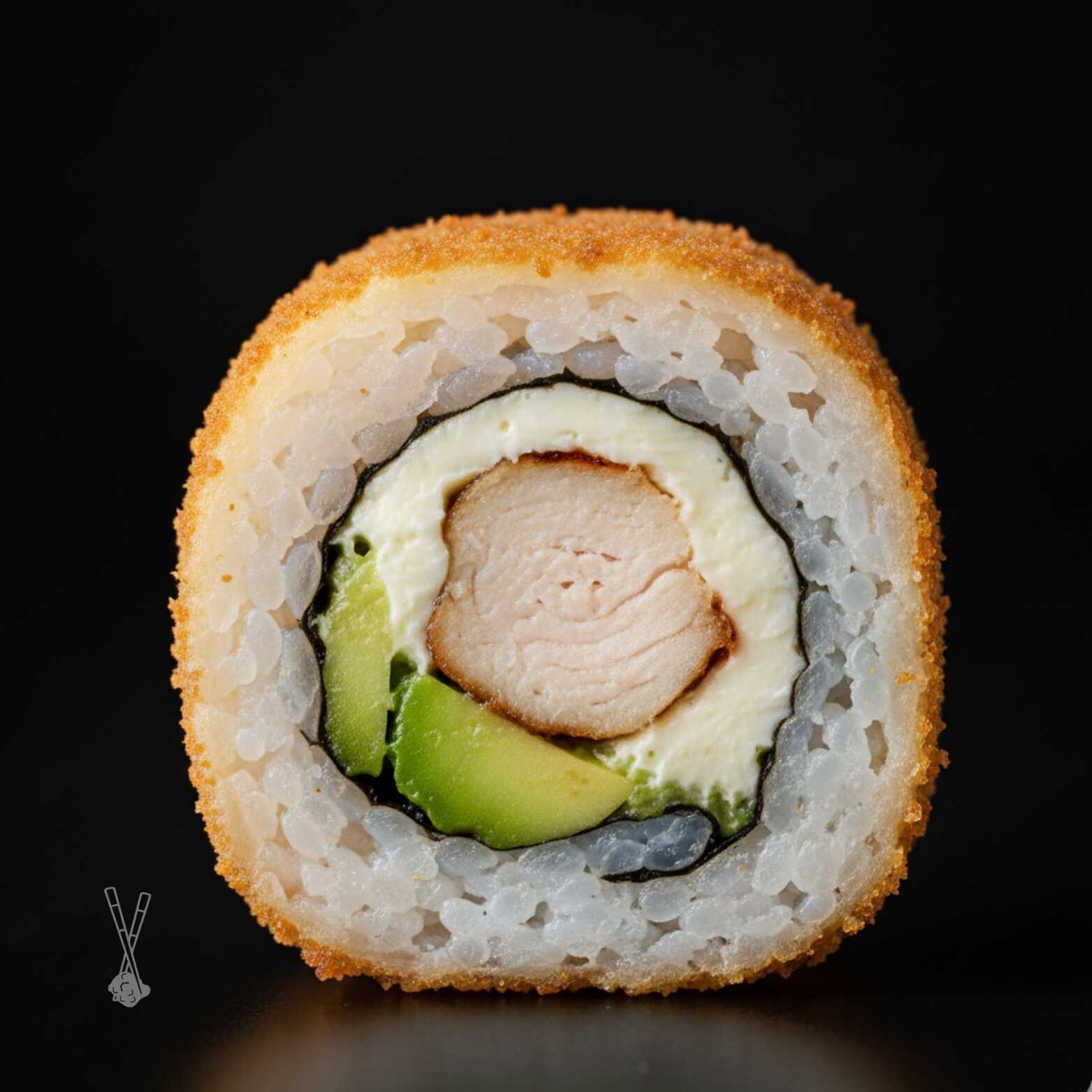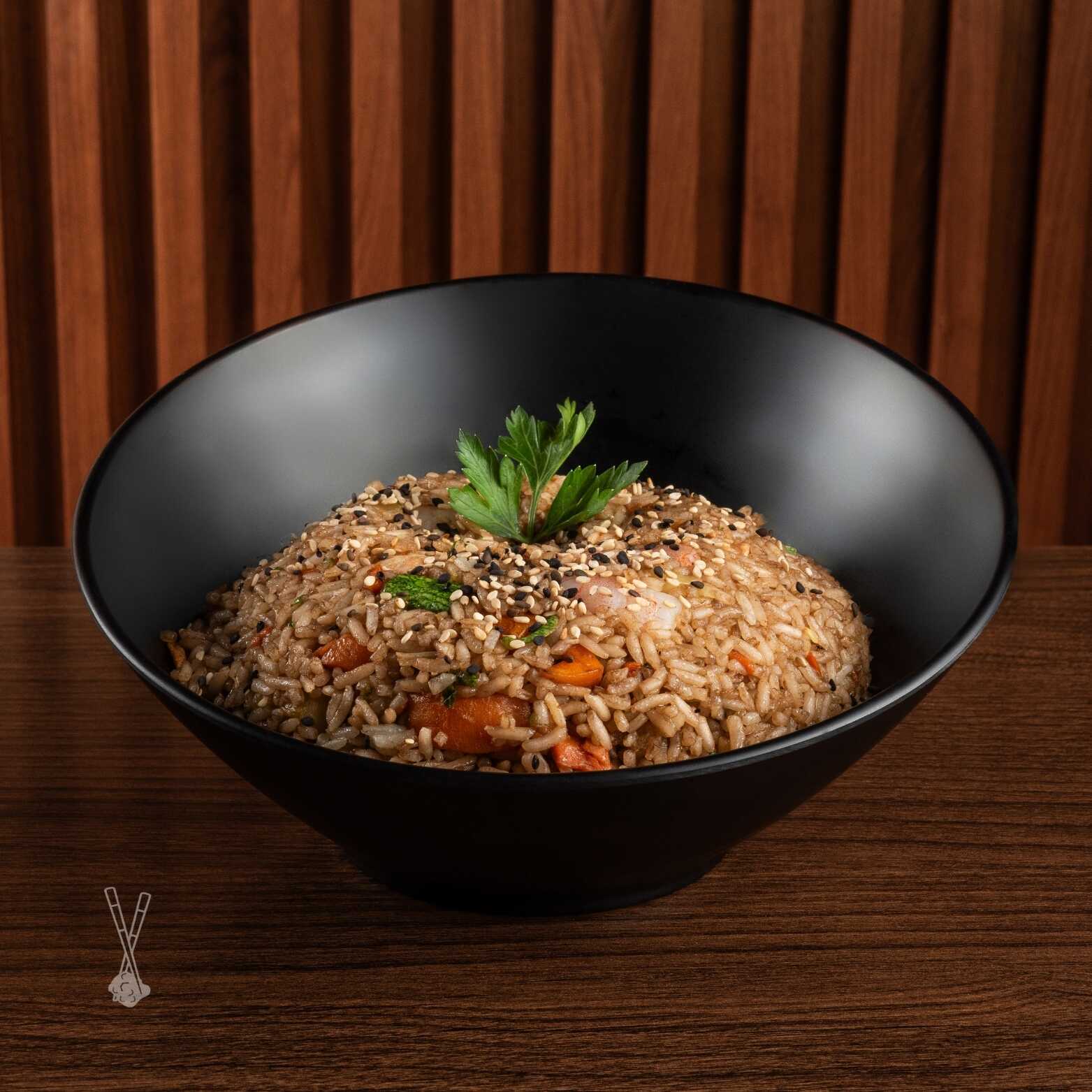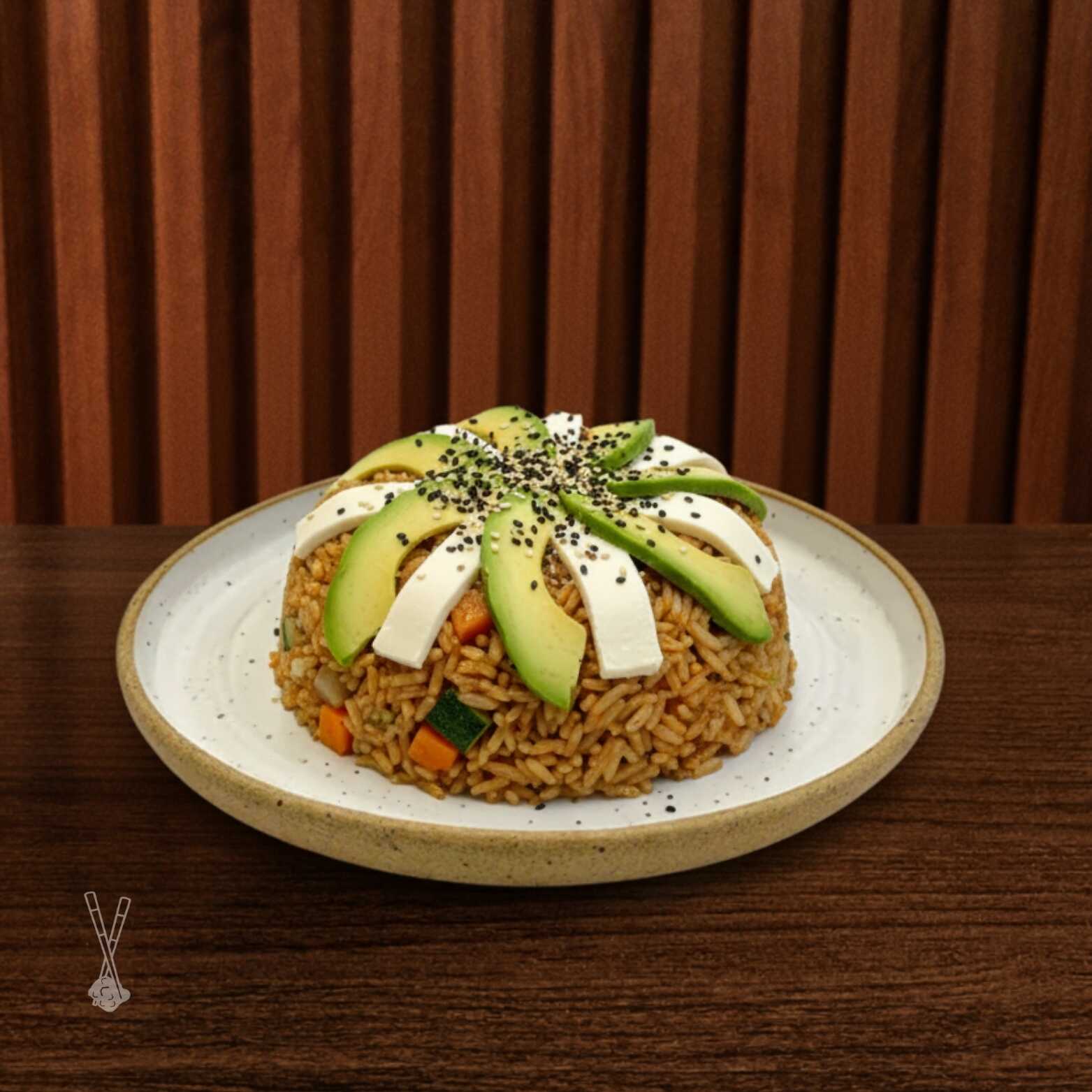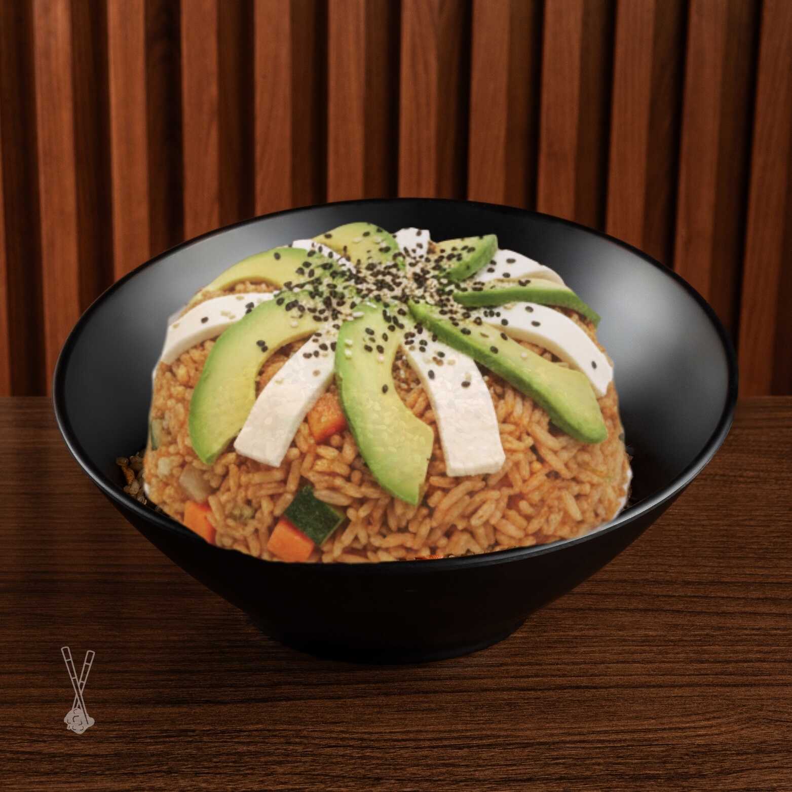 Arroz frito, salteado con soya, mezcla de verduras, especias y acompañado con camarón cocido, carne y pollo a la plancha. Coronado con laminas de aguacate y queso crema.