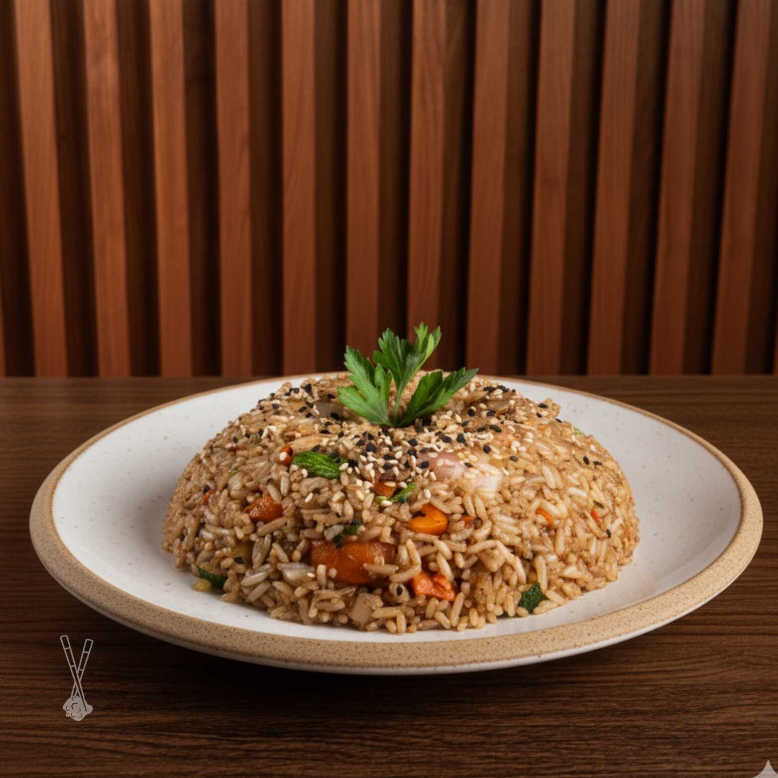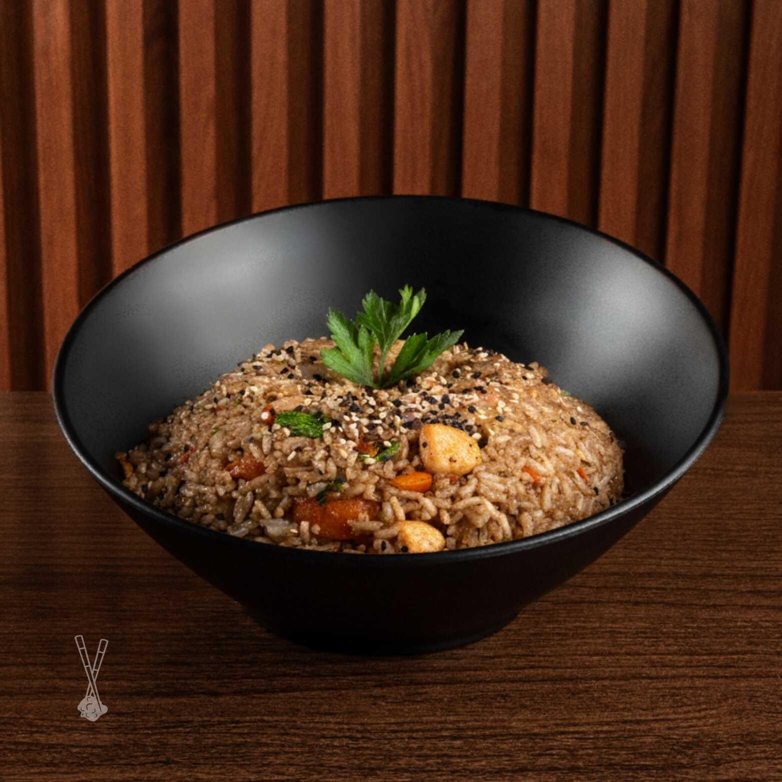 Arroz frito, salteado con soya, mezcla de verduras, especias y acompañado con camarón cocido, carne y pollo a la plancha.