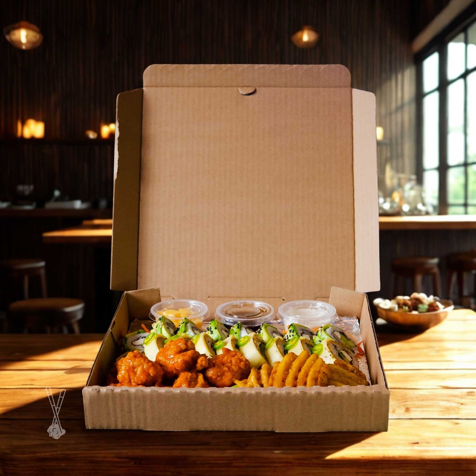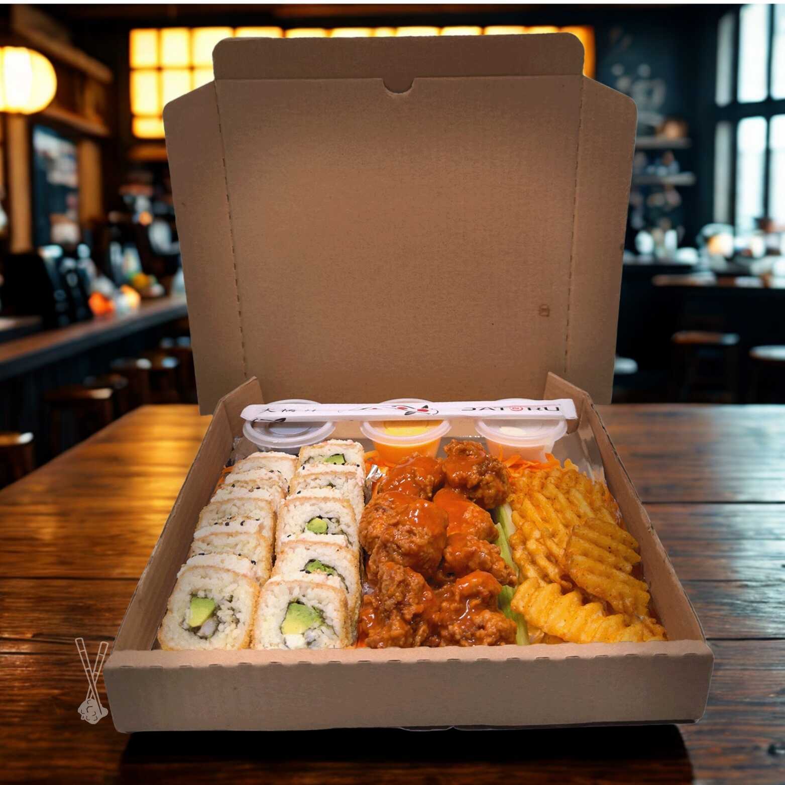 2 Rollos tradicionales. 1 Orden de boneless o alitas. 1/2 Orden de complemento. 3 aderezos.