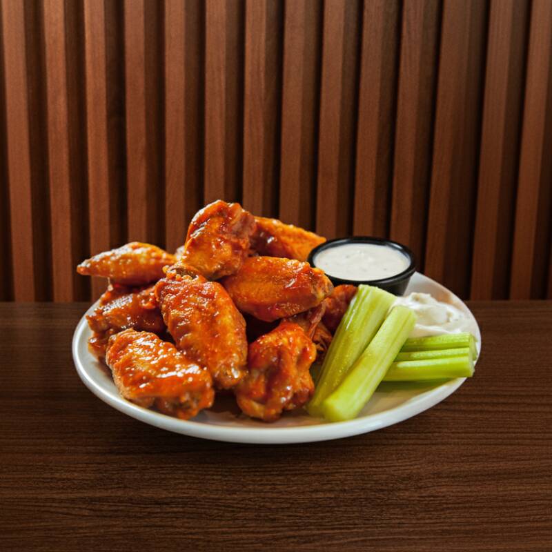5-6 pz de alitas (300 gr) bañadas en salsa con apio y zanahoria.